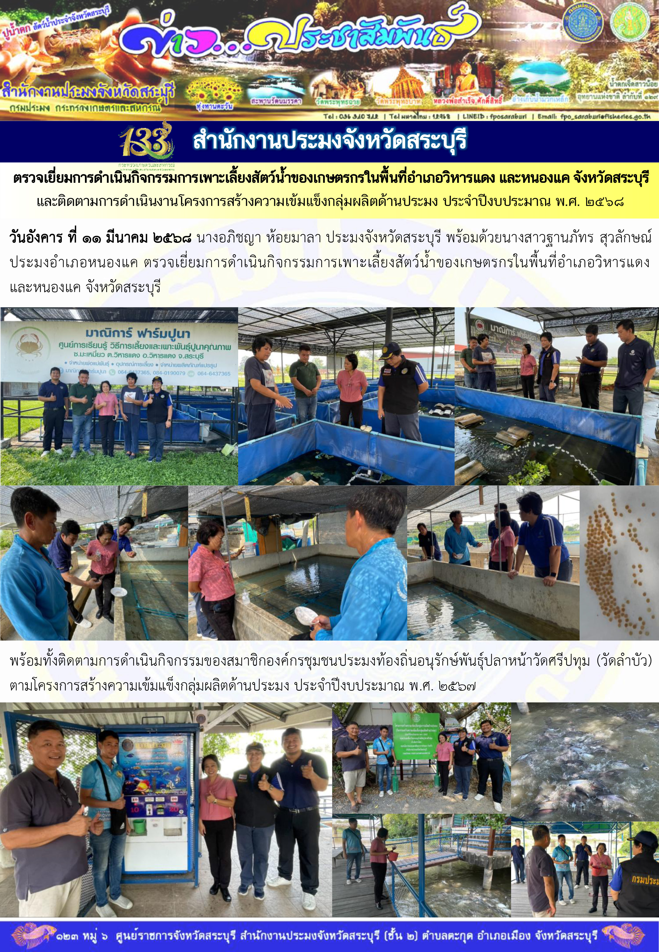 สำนักงานประมงจังหวัดสระบุรี ตรวจเยี่ยมการดำเนินกิจกรรมการเพาะเลี้ยงสัตว์น้ำของเกษตรกรในพื้นที่อำเภอวิหารแดง และหนองแค จังหวัดสระบุรี และติดตามการดำเนินงานโครงการสร้างความเข้มแข็งกลุ่มผลิตด้านประมง ประจำปีงบประมาณ พ.ศ. 2568