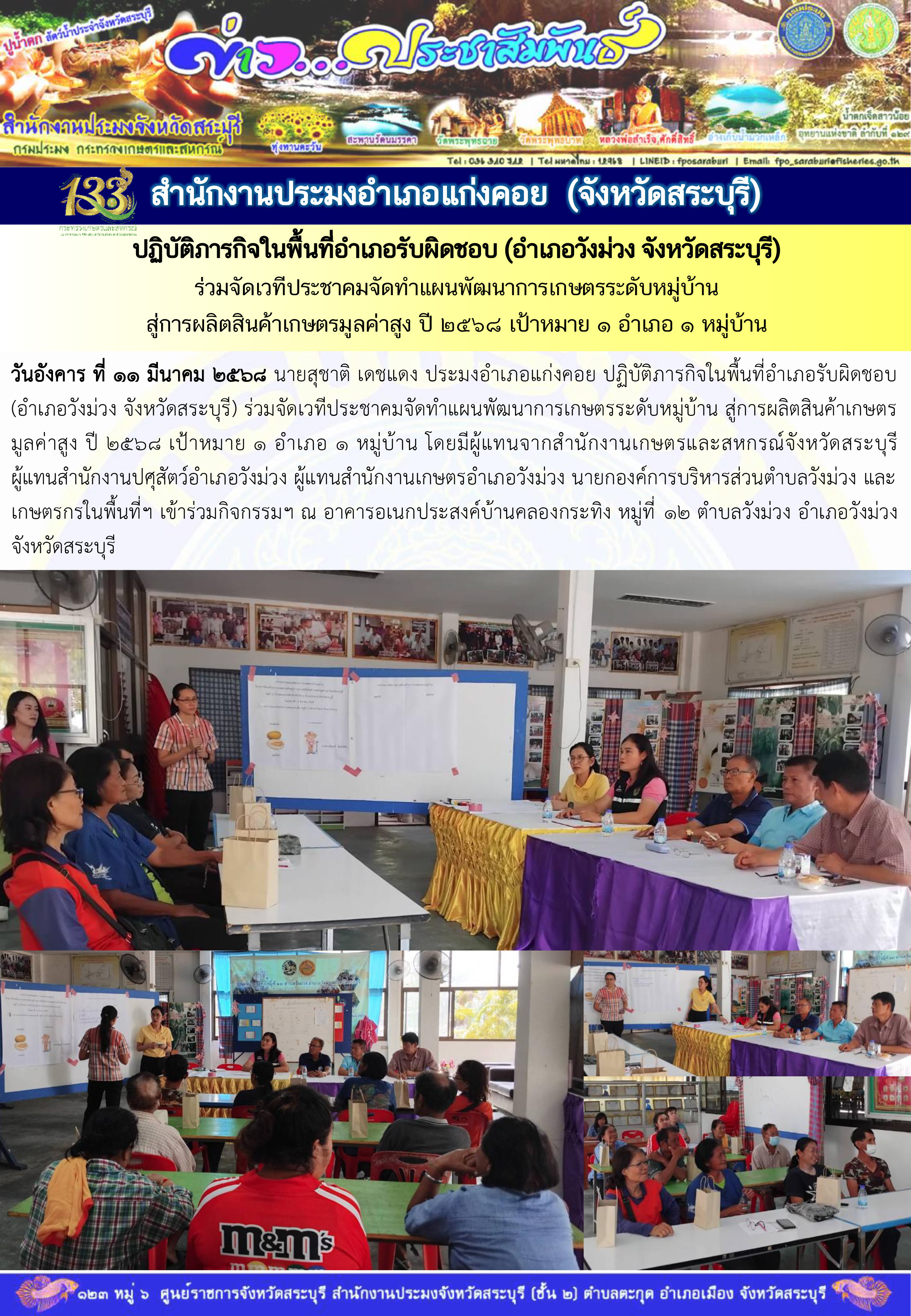 สำนักงานประมงอำเภอแก่งคอย ปฏิบัติภารกิจในพื้นที่อำเภอรับผิดชอบ (อำเภอวังม่วง จังหวัดสระบุรี) ร่วมจัดเวทีประชาคมจัดทำแผนพัฒนาการเกษตรระดับหมู่บ้าน สู่การผลิตสินค้าเกษตรมูลค่าสูง ปี 2568 เป้าหมาย 1 อำเภอ 1 หมู่บ้าน