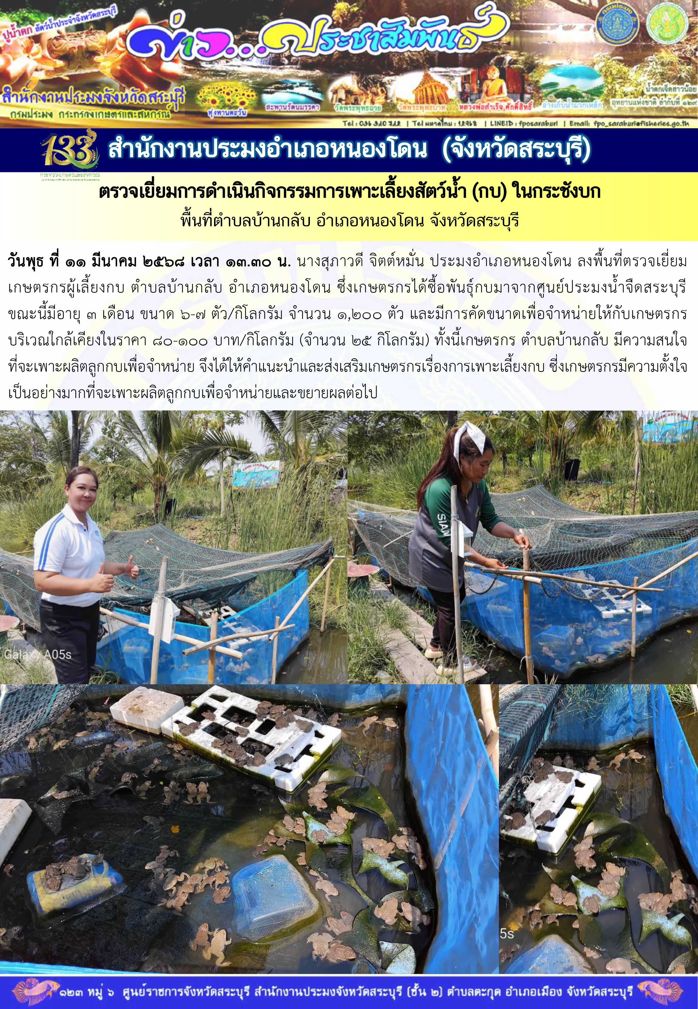 สำนักงานประมงอำเภอหนองโดน ตรวจเยี่ยมการดำเนินกิจกรรมการเพาะเลี้ยงสัตว์น้ำ (กบ) ในกระชังบก พื้นที่ตำบลบ้านกลับ อำเภอหนองโดน จังหวัดสระบุรี