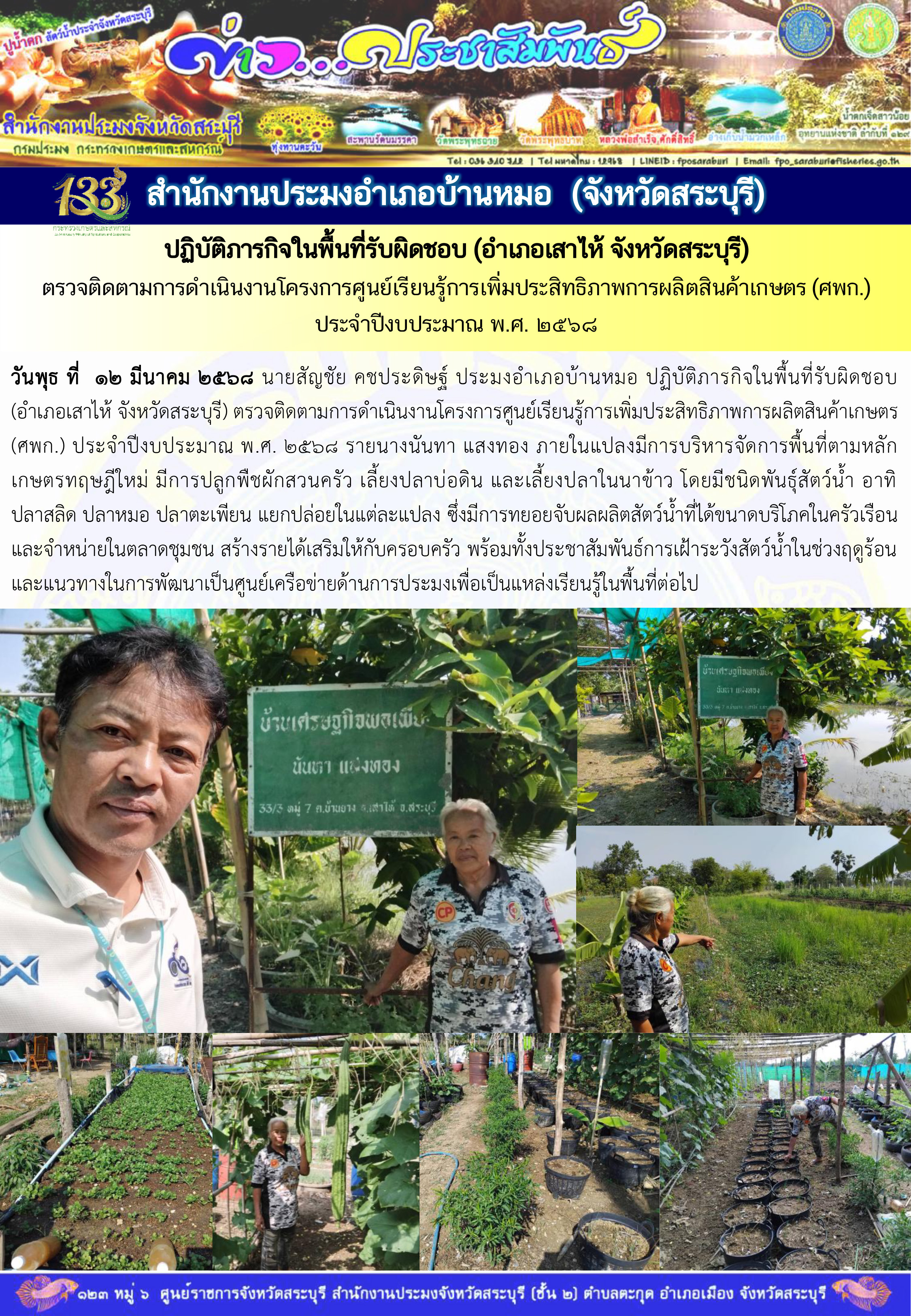 สำนักงานประมงอำเภอบ้านหมอ ปฏิบัติภารกิจในพื้นที่รับผิดชอบ (อำเภอเสาไห้ จังหวัดสระบุรี) ตรวจติดตามการดำเนินงานโครงการศูนย์เรียนรู้การเพิ่มประสิทธิภาพการผลิตสินค้าเกษตร (ศพก.) ประจำปีงบประมาณ พ.ศ. 2568