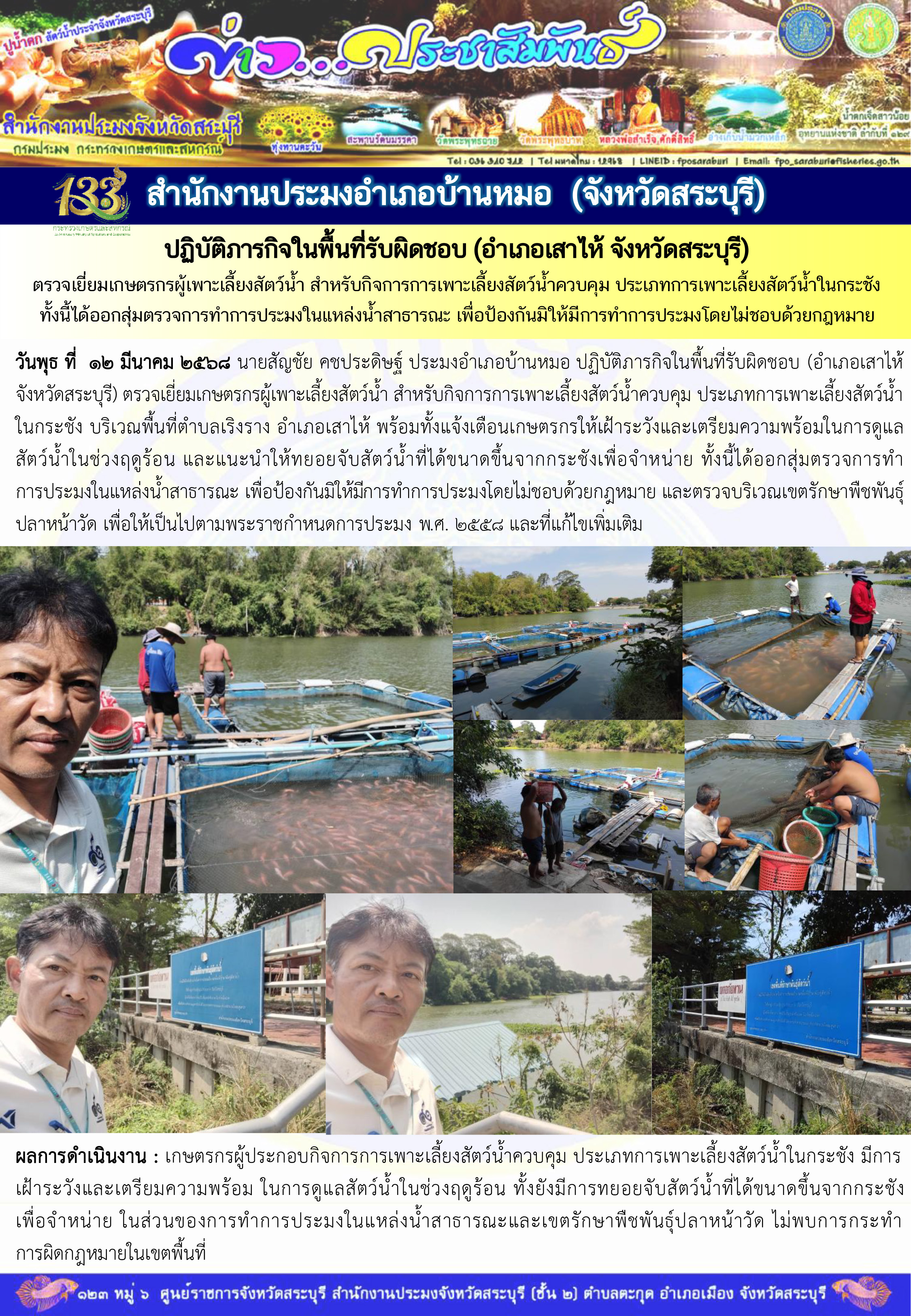 ภารกิจประจำวันที่ 12 มีนาคม 2568 สำนักงานประมงจังหวัดสระบุรี