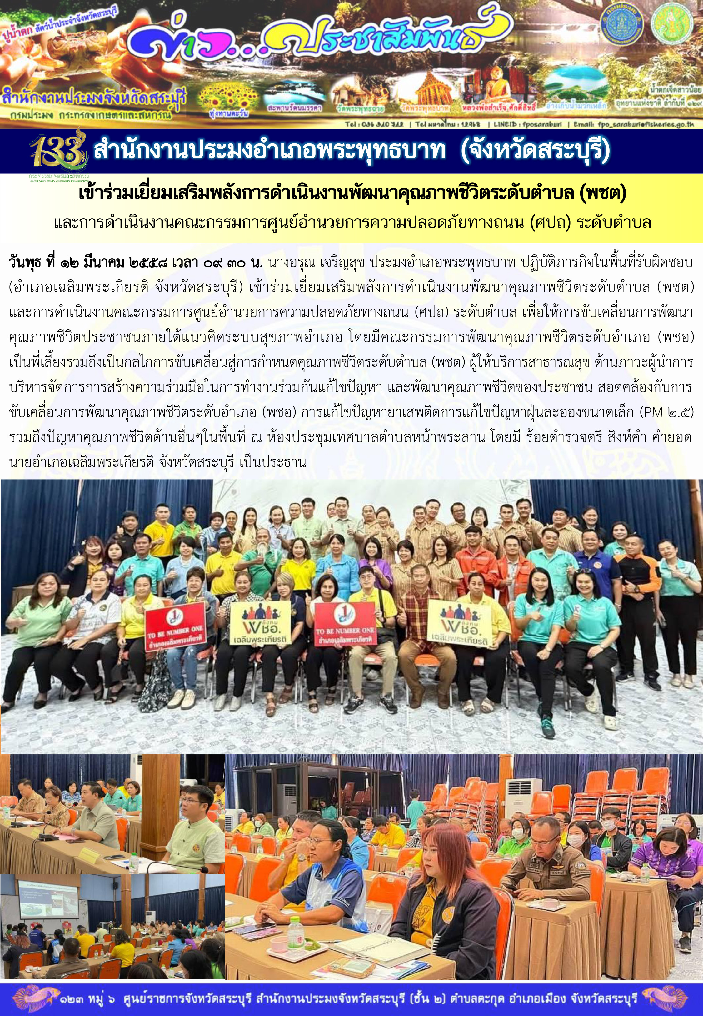 สำนักงานประมงอำเภอพระพุทธบาท เข้าร่วมเยี่ยมเสริมพลังการดำเนินงานพัฒนาคุณภาพชีวิตระดับตำบล (พชต) และการดำเนินงานคณะกรรมการศูนย์อำนวยการความปลอดภัยทางถนน (ศปถ) ระดับตำบล