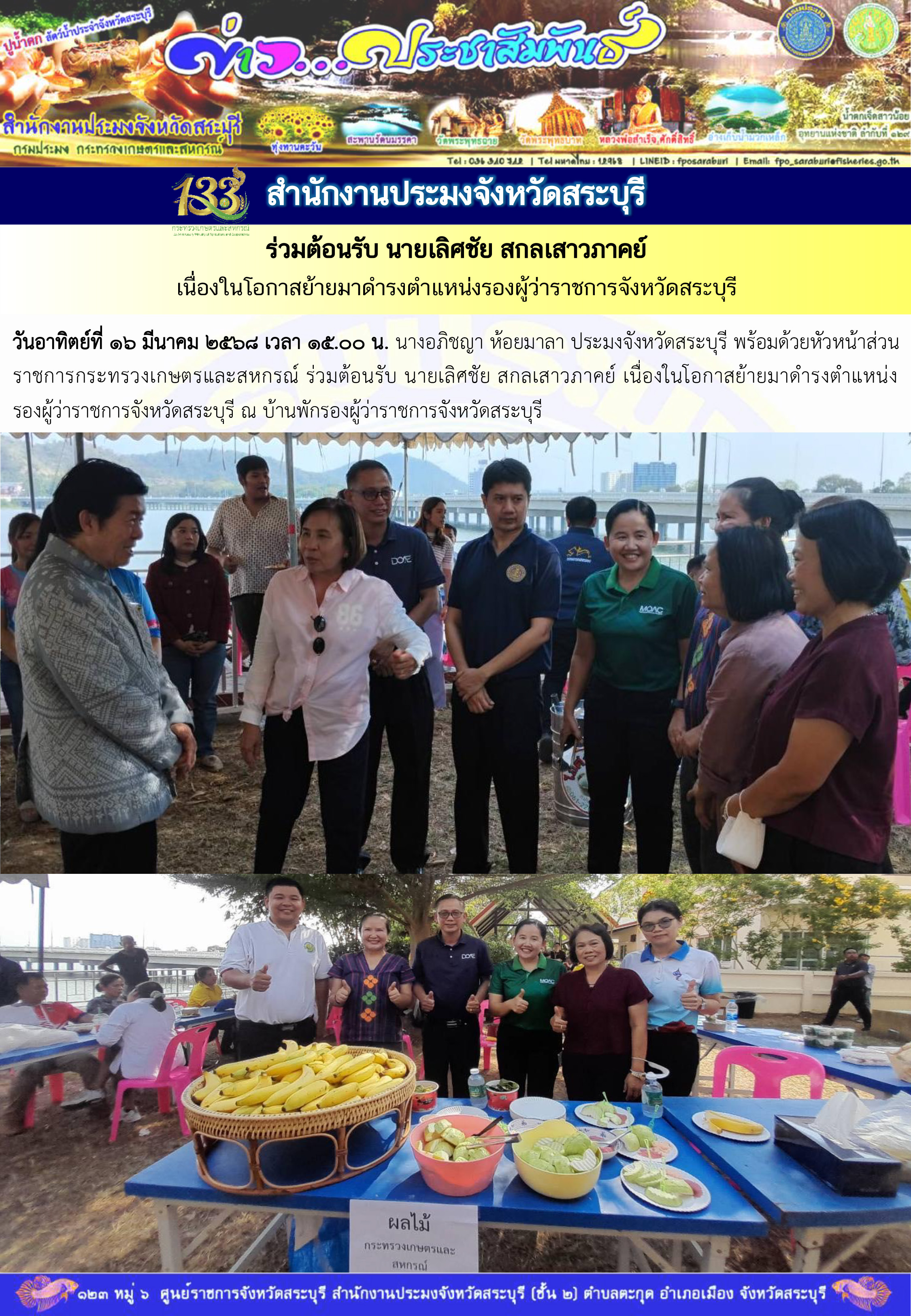 วันอาทิตย์ที่ 16 มีนาคม 2568 เวลา 15.00 น. นางอภิชญา ห้อยมาลา ประมงจังหวัดสระบุรี พร้อมด้วยหัวหน้าส่วนราชการกระทรวงเกษตรและสหกรณ์ ร่วมต้อนรับ นายเลิศชัย สกลเสาวภาคย์ เนื่องในโอกาสย้ายมาดำรงตำแหน่งรองผู้ว่าราชการจังหวัดสระบุรี ณ บ้านพักรองผู้ว่าราชการจังหวัดสระบุรี