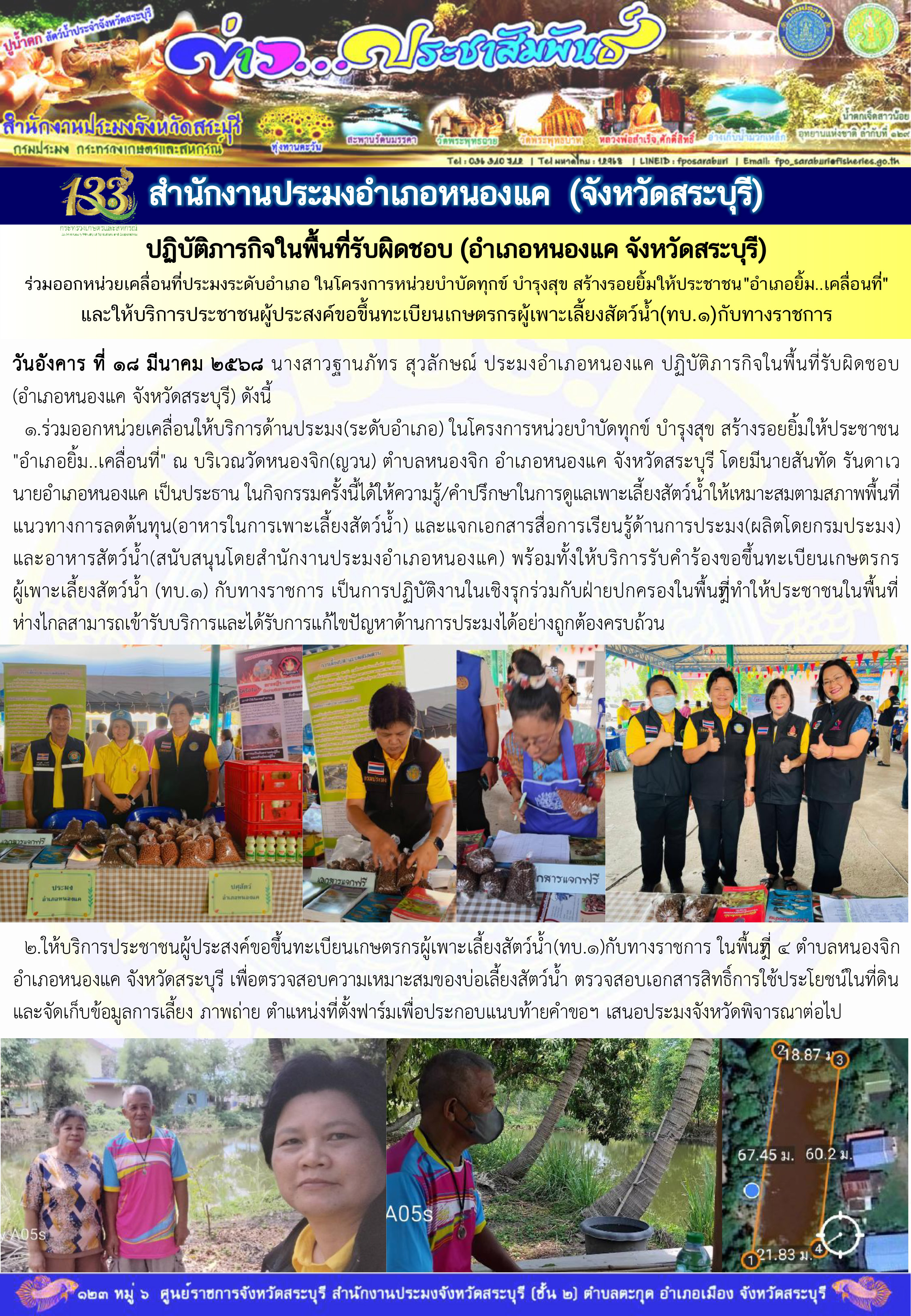 ภารกิจประจำวันที่ 18 มีนาคม 2568 สำนักงานประมงจังหวัดสระบุรี..คลิก