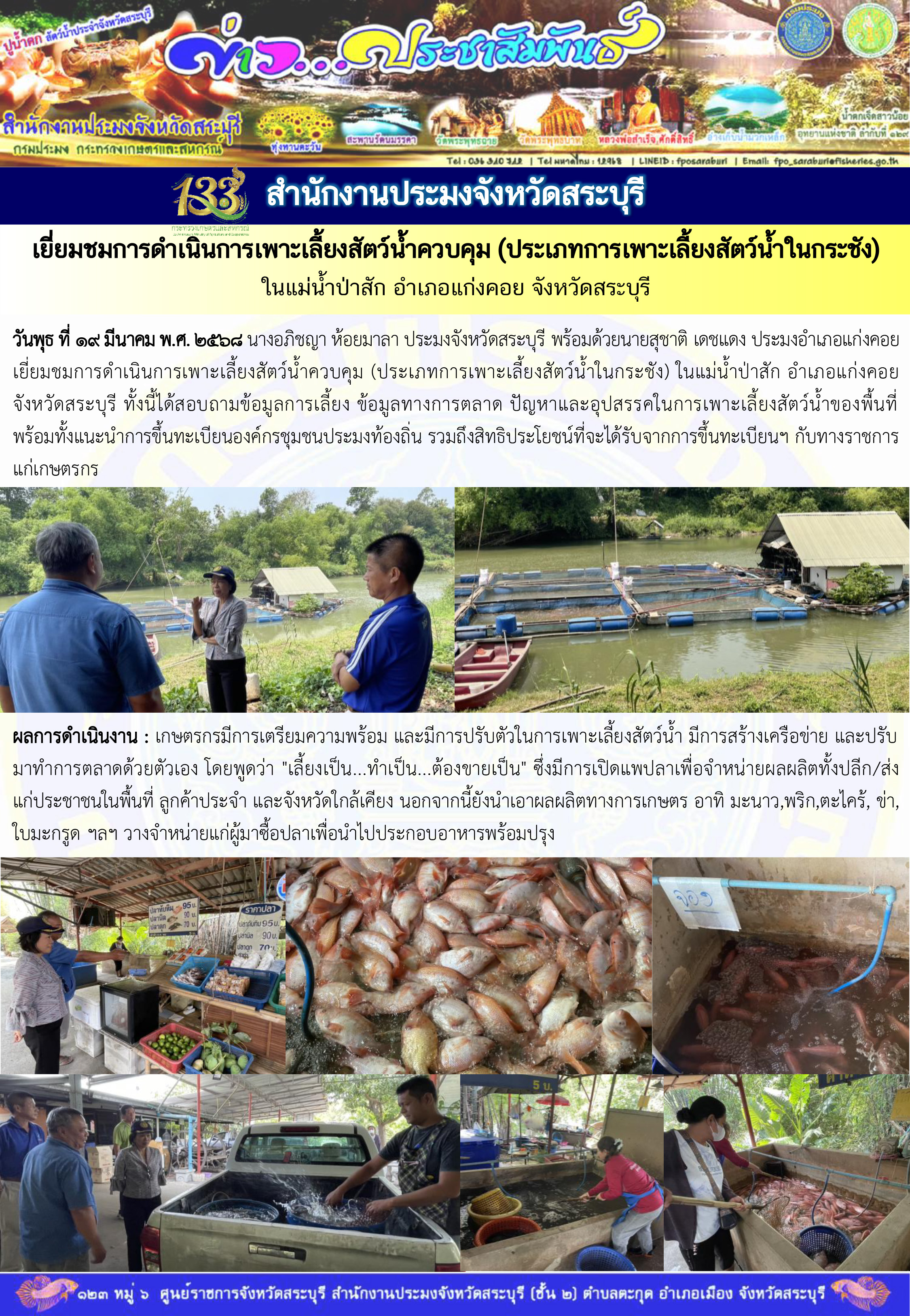 วันพุธ ที่ 19 มีนาคม พ.ศ. 2568 นางอภิชญา ห้อยมาลา ประมงจังหวัดสระบุรี พร้อมด้วยนายสุชาติ เดชแดง ประมงอำเภอแก่งคอย เยี่ยมชมการดำเนินการเพาะเลี้ยงสัตว์น้ำควบคุม (ประเภทการเพาะเลี้ยงสัตว์น้ำในกระชัง) ในแม่น้ำป่าสัก อำเภอแก่งคอย จังหวัดสระบุรี ทั้งนี้ได้สอบถามข้อมูลการเลี้ยง ข้อมูลทางการตลาด ปัญหาและอุปสรรคในการเพาะเลี้ยงสัตว์น้ำของพื้นที่ พร้อมทั้งแนะนำการขึ้นทะเบียนองค์กรชุมชนประมงท้องถิ่น รวมถึงสิทธิประโยชน์ที่จะได้รับจากการขึ้นทะเบียนฯ กับทางราชการแก่เกษตรกร