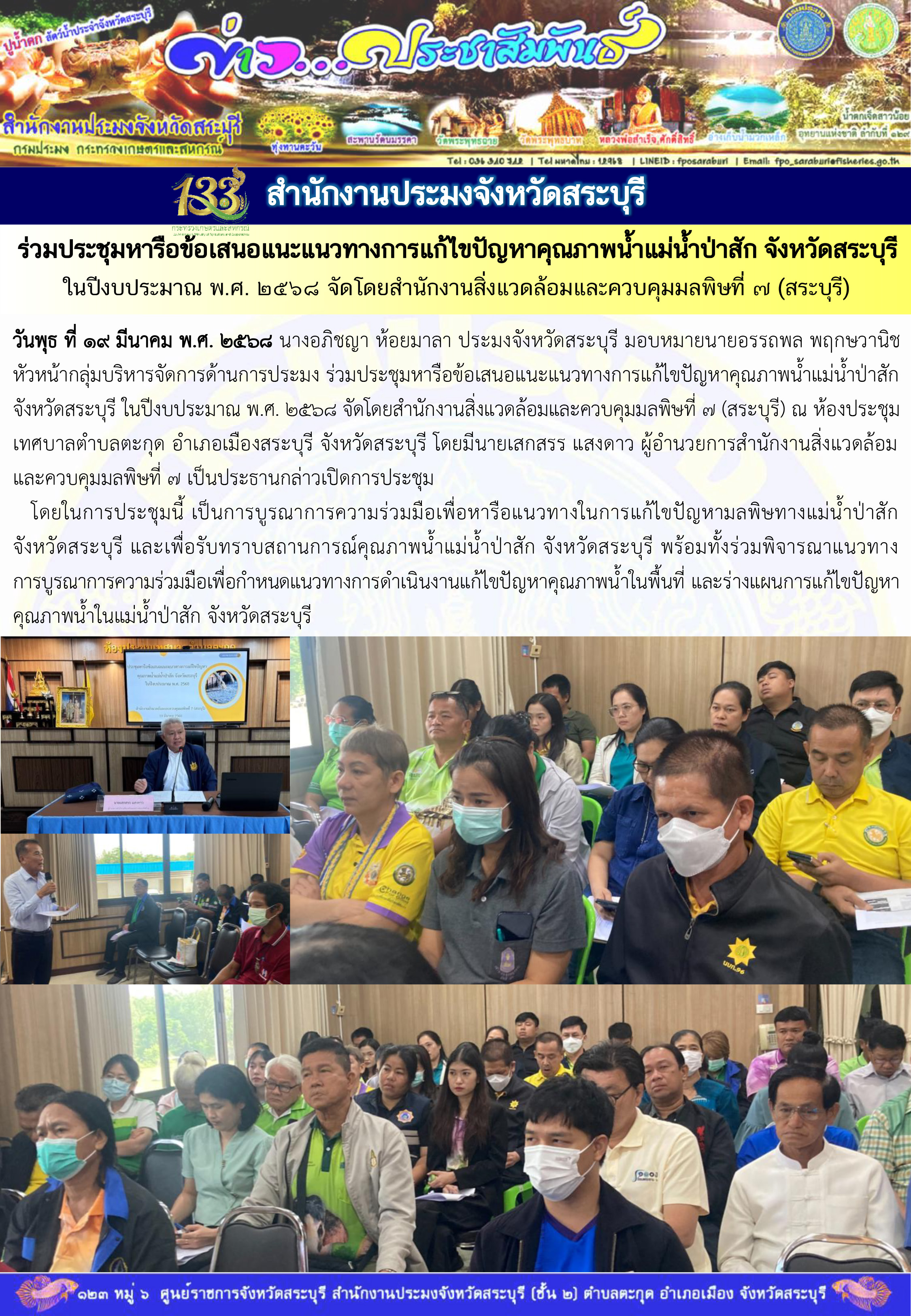 วันพุธ ที่ 19 มีนาคม พ.ศ. 2568 นางอภิชญา ห้อยมาลา ประมงจังหวัดสระบุรี มอบหมายนายอรรถพล พฤกษวานิช หัวหน้ากลุ่มบริหารจัดการด้านการประมง ร่วมประชุมหารือข้อเสนอแนะแนวทางการแก้ไขปัญหาคุณภาพน้ำแม่น้ำป่าสัก จังหวัดสระบุรี ในปีงบประมาณ พ.ศ. 2568 จัดโดยสำนักงานสิ่งแวดล้อมและควบคุมมลพิษที่ 7(สระบุรี) ณ ห้องประชุมเทศบาลตำบลตะกุด อำเภอเมืองสระบุรี จังหวัดสระบุรี โดยมีนายเสกสรร แสงดาว ผู้อำนวยการสำนักงานสิ่งแวดล้อมและควบคุมมลพิษที่ 7 เป็นประธานกล่าวเปิดการประชุม