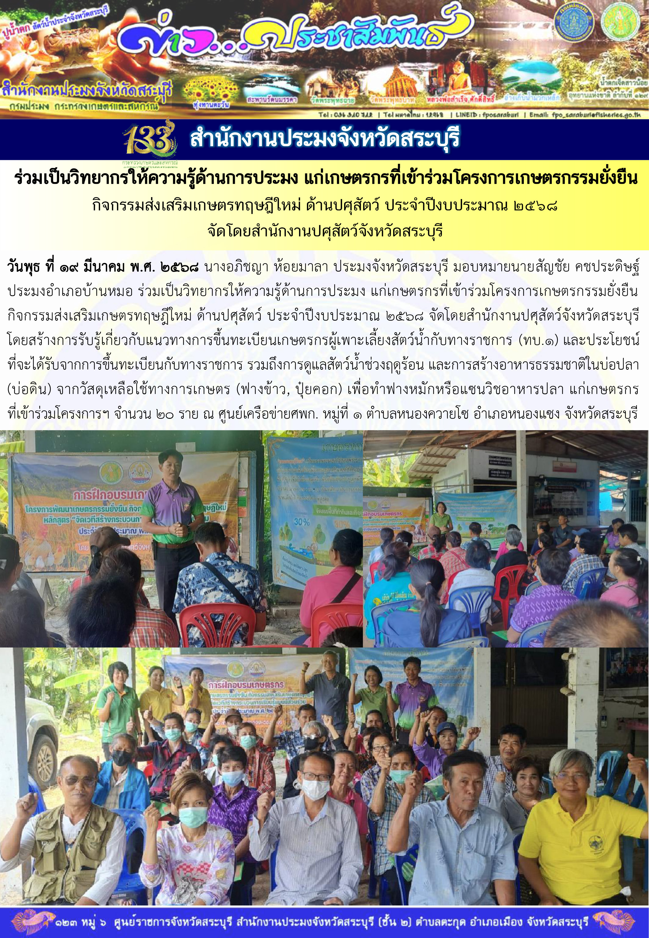 วันพุธ ที่ 19 มีนาคม พ.ศ. 2568 นางอภิชญา ห้อยมาลา ประมงจังหวัดสระบุรี มอบหมายนายสัญชัย คชประดิษฐ์ ประมงอำเภอบ้านหมอ ร่วมเป็นวิทยากรให้ความรู้ด้านการประมง แก่เกษตรกรที่เข้าร่วมโครงการเกษตรกรรมยั่งยืน กิจกรรมส่งเสริมเกษตรทฤษฎีใหม่ ด้านปศุสัตว์ ประจำปีงบประมาณ 2568 จัดโดยสำนักงานปศุสัตว์จังหวัดสระบุรี โดยสร้างการรับรู้เกี่ยวกับแนวทางการขึ้นทะเบียนเกษตรกรผู้เพาะเลี้ยงสัตว์น้ำกับทางราชการ (ทบ.1) และประโยชน์ที่จะได้รับจากการขึ้นทะเบียนกับทางราชการ รวมถึงการดูแลสัตว์น้ำช่วงฤดูร้อน และการสร้างอาหารธรรมชาติในบ่อปลา(บ่อดิน) จากวัสดุเหลือใช้ทางการเกษตร (ฟางข้าว, ปุ๋ยคอก) เพื่อทำฟางหมักหรือแซนวิชอาหารปลา แก่เกษตรกรที่เข้าร่วมโครงการฯ จำนวน 20 ราย ณ ศูนย์เครือข่ายศพก. หมู่ที่ 1 ตำบลหนองควายโซ อำเภอหนองแซง จังหวัดสระบุรี