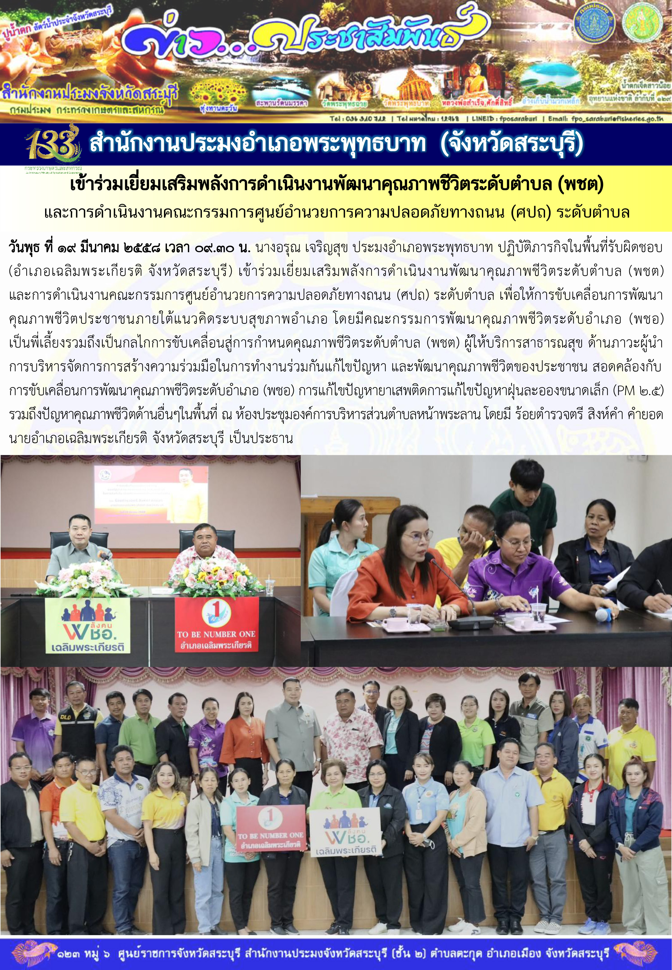สำนักงานประมงอำเภอพระพุทธบาท เข้าร่วมเยี่ยมเสริมพลังการดำเนินงานพัฒนาคุณภาพชีวิตระดับตำบล (พชต) และการดำเนินงานคณะกรรมการศูนย์อำนวยการความปลอดภัยทางถนน (ศปถ) ระดับตำบล