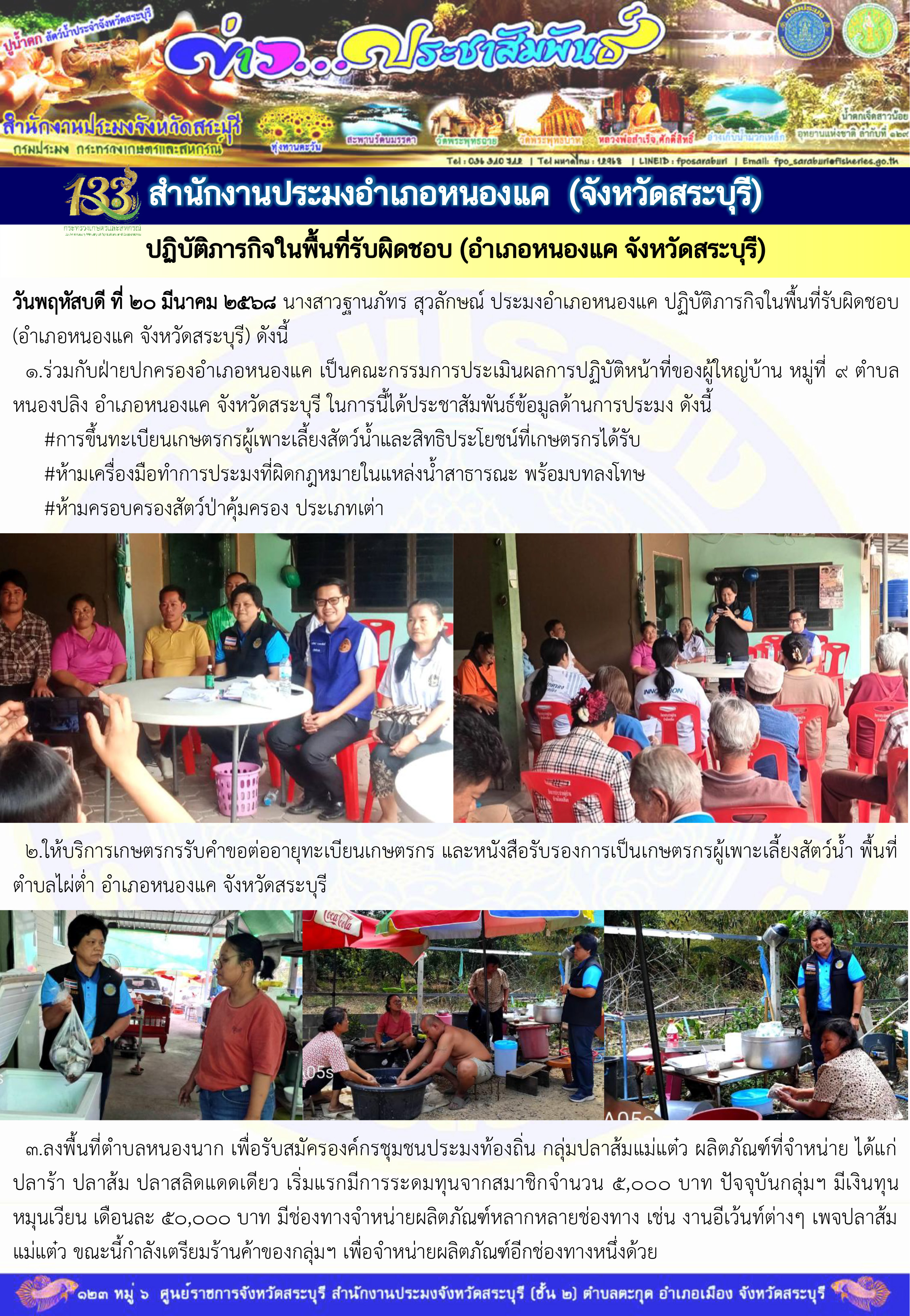 วันพฤหัสบดี ที่ 20 มีนาคม 2568 นางสาวฐานภัทร สุวลักษณ์ ประมงอำเภอหนองแค ปฏิบัติภารกิจในพื้นที่รับผิดชอบ (อำเภอหนองแค จังหวัดสระบุรี) ดังนี้