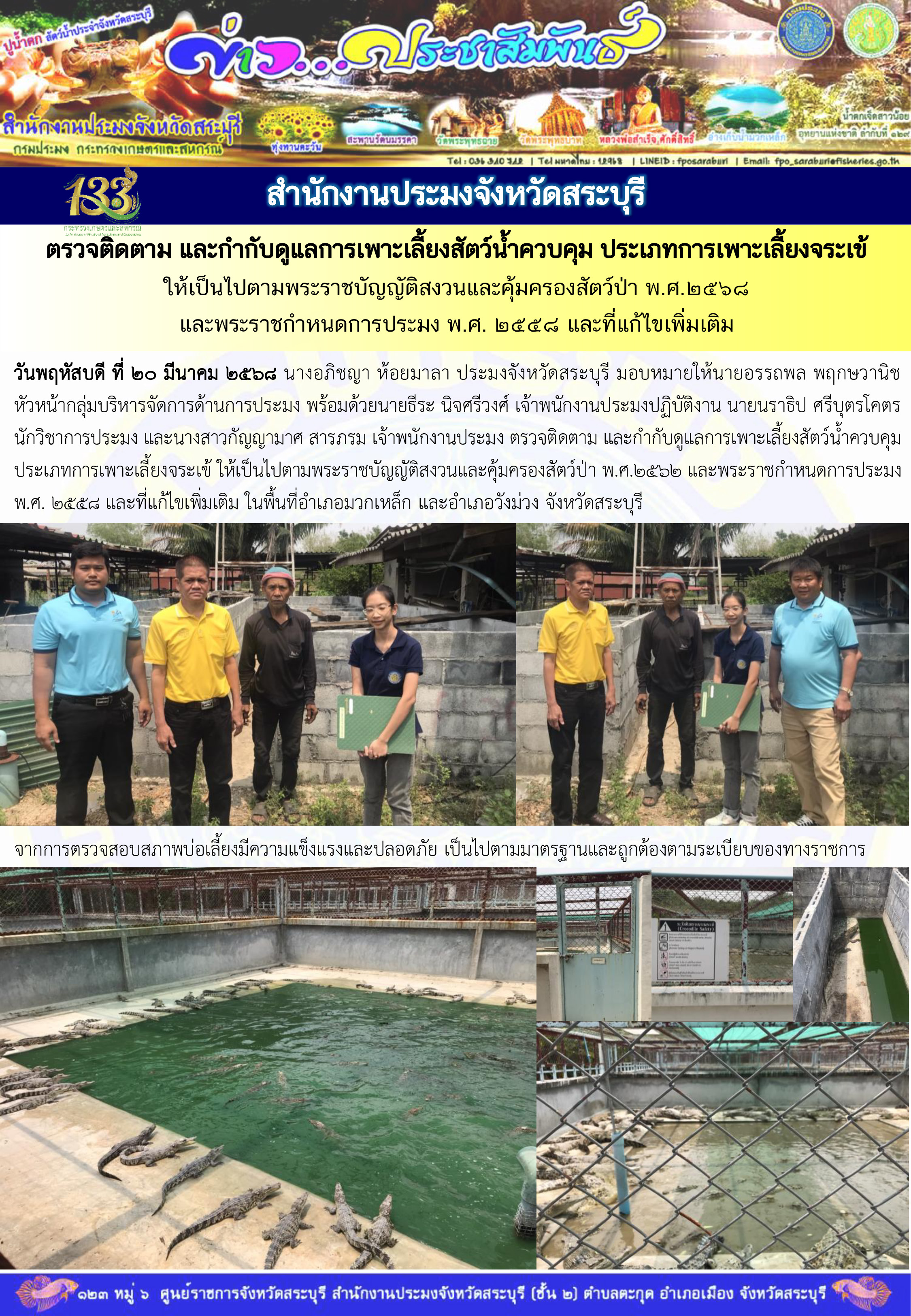 สำนักงานประมงจังหวัดสระบุรี ตรวจติดตาม และกำกับดูแลการเพาะเลี้ยงสัตว์น้ำควบคุม ประเภทการเพาะเลี้ยงจระเข้ ให้เป็นไปตามพระราชบัญญัติสงวนและคุ้มครองสัตว์ป่า พ.ศ.2562 และพระราชกำหนดการประมง พ.ศ. 2558 และที่แก้ไขเพิ่มเติม