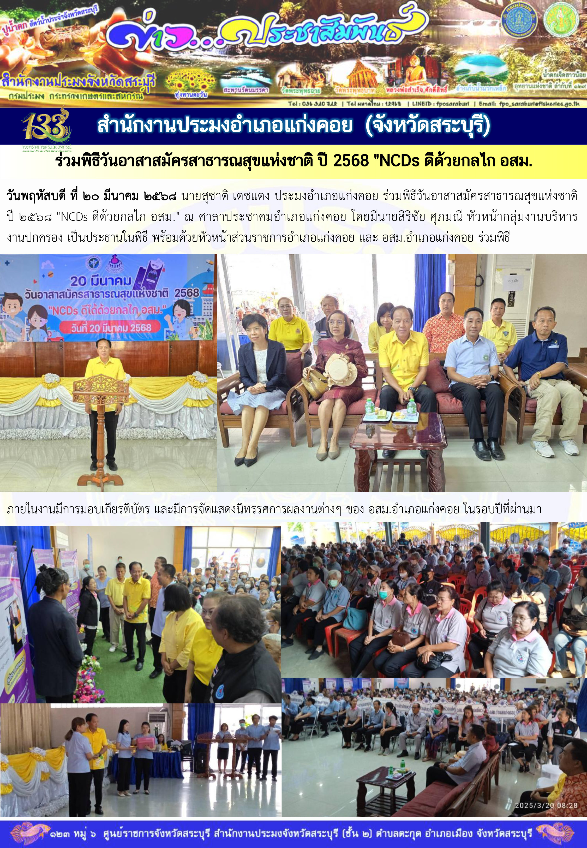 วันพฤหัสบดี ที่ 20 มีนาคม 2568 นายสุชาติ เดชแดง ประมงอำเภอแก่งคอย ร่วมพิธีวันอาสาสมัครสาธารณสุขแห่งชาติ ปี 2568 "NCDs ดีด้วยกลไก อสม." ณ ศาลาประชาคมอำเภอแก่งคอย จังหวัดสระบุรี โดยมีนายสิริชัย ศุภมณี หัวหน้ากลุ่มงานบริหารงานปกครอง เป็นประธานในพิธี พร้อมด้วยหัวหน้าส่วนราชการอำเภอแก่งคอย และ อสม.อำเภอแก่งคอย ร่วมพิธีฯ