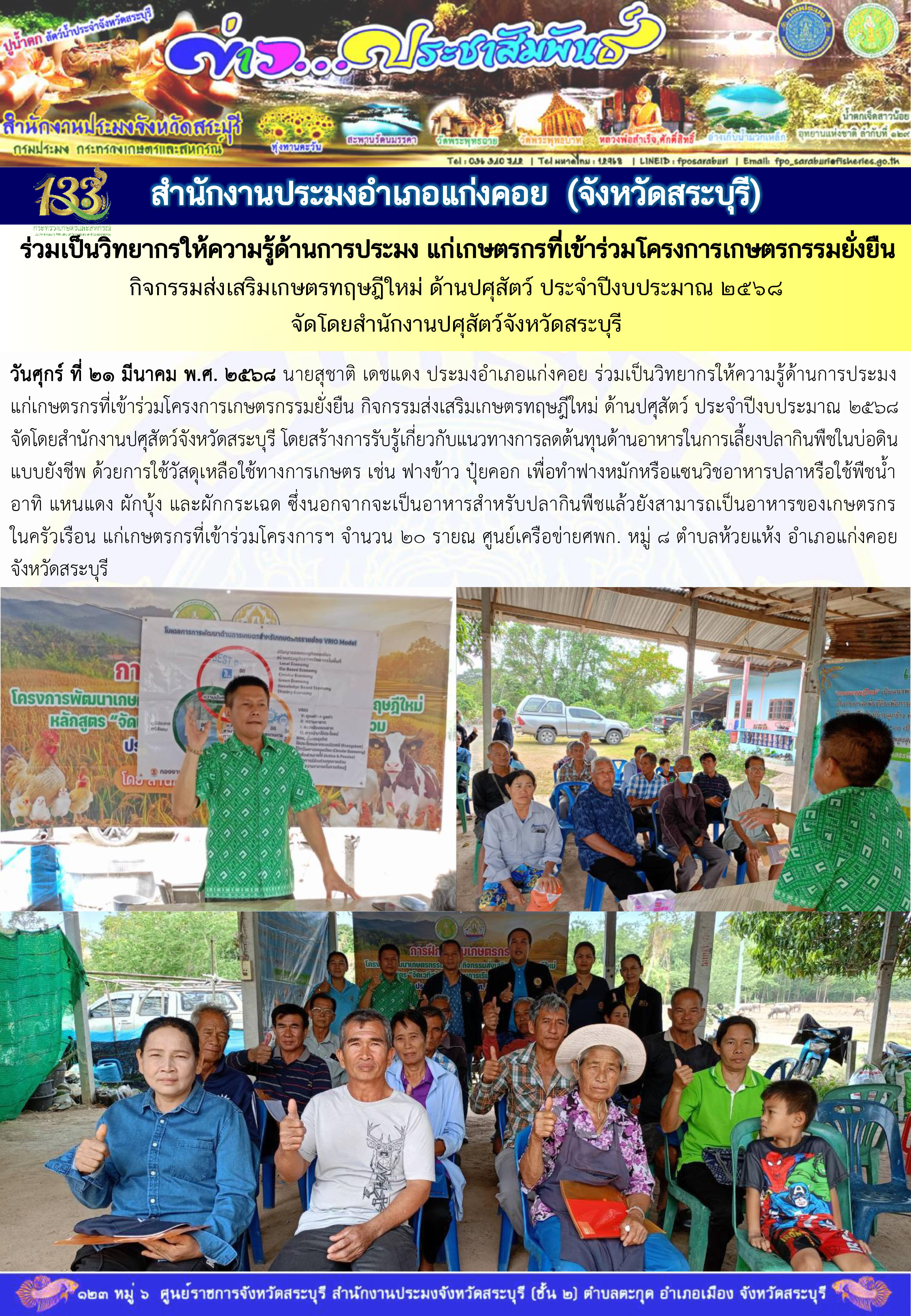 วันศุกร์ ที่ 21 มีนาคม พ.ศ. 2568 นายสุชาติ เดชแดง ประมงอำเภอแก่งคอย ร่วมเป็นวิทยากรให้ความรู้ด้านการประมง แก่เกษตรกรที่เข้าร่วมโครงการเกษตรกรรมยั่งยืน กิจกรรมส่งเสริมเกษตรทฤษฎีใหม่ ด้านปศุสัตว์ ประจำปีงบประมาณ 2568 จัดโดยสำนักงานปศุสัตว์จังหวัดสระบุรี โดยสร้างการรับรู้เกี่ยวกับแนวทางการลดต้นทุนด้านอาหารในการเลี้ยงปลากินพืชในบ่อดินแบบยังชีพ ด้วยการใช้วัสดุเหลือใช้ทางการเกษตร เช่น ฟางข้าว ปุ๋ยคอก เพื่อทำฟางหมักหรือแซนวิชอาหารปลา หรือใช้พืชน้ำ อาทิ แหนแดง ผักบุ้ง และผักกระเฉด ซึ่งนอกจากจะเป็นอาหารสำหรับปลากินพืชแล้วยังสามารถเป็นอาหารของเกษตรกรในครัวเรือน แก่เกษตรกรที่เข้าร่วมโครงการฯ จำนวน 20 ราย ณ ศูนย์เครือข่ายศพก. หมู่ 8 ตำบลห้วยแห้ง อำเภอแก่งคอย จังหวัดสระบุรี