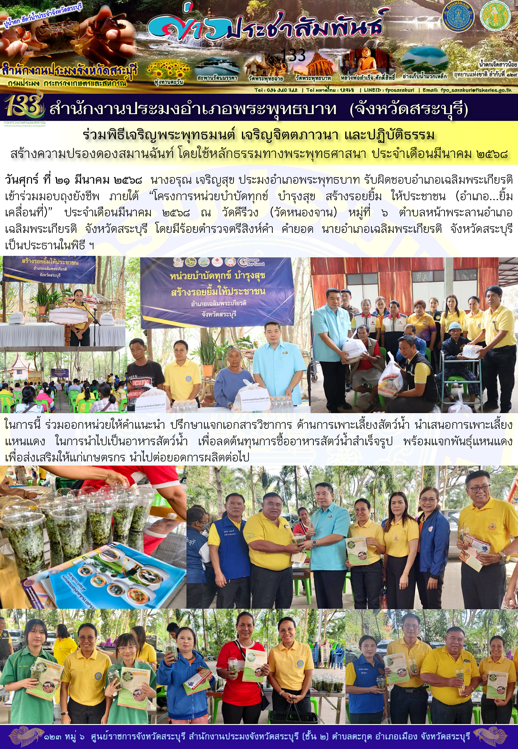วันศุกร์ ที่ ๒๑ มีนาคม ๒๕๖๘  นางอรุณ เจริญสุข ประมงอำเภอพระพุทธบาท รับผิดชอบอำเภอเฉลิมพระเกียรติ เข้าร่วมมอบถุงยังชีพ ภายใต้ “โครงการหน่วยบำบัดทุกข์ บำรุงสุข สร้างรอยยิ้ม ให้ประชาชน (อำเภอ...ยิ้มเคลื่อนที่)” ประจำเดือนมีนาคม ๒๕๖๘ ณ วัดคีรีวง (วัดหนองจาน) หมู่ที่ ๖ ตำบลหน้าพระลานอำเภอเฉลิมพระเกียรติ จังหวัดสระบุรี โดยมีร้อยตำรวจตรีสิงห์คำ คำยอด นายอำเภอเฉลิมพระเกียรติ จังหวัดสระบุรี เป็นประธานในพิธี ฯ
