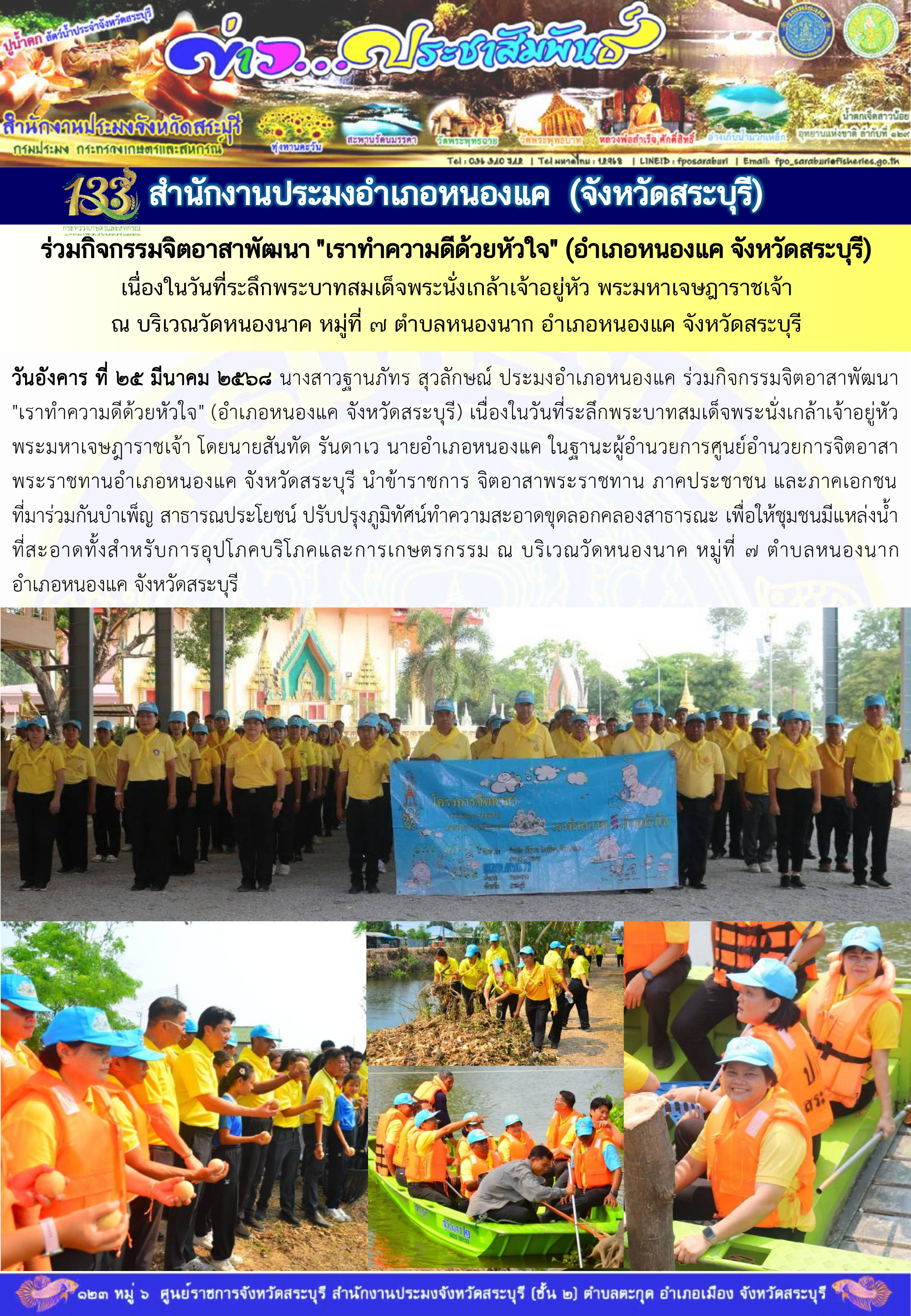 วันอังคาร ที่ 25 มีนาคม 2568 นางสาวฐานภัทร สุวลักษณ์ ประมงอำเภอหนองแค ร่วมกิจกรรมจิตอาสาพัฒนา "เราทำความดีด้วยหัวใจ" (อำเภอหนองแค จังหวัดสระบุรี) เนื่องในวันที่ระลึกพระบาทสมเด็จพระนั่งเกล้าเจ้าอยู่หัว พระมหาเจษฎาราชเจ้า โดยนายสันทัด รันดาเว นายอำเภอหนองแค ในฐานะผู้อำนวยการศูนย์อำนวยการจิตอาสาพระราชทานอำเภอหนองแค จังหวัดสระบุรี นำข้าราชการ จิตอาสาพระราชทาน ภาคประชาชน และภาคเอกชน ที่มาร่วมกันบำเพ็ญ สาธารณประโยชน์ ปรับปรุงภูมิทัศน์ทำความสะอาดขุดลอกคลองสาธารณะ ณ บริเวณวัดหนองนาค หมู่ที่ 7 ตำบลหนองนาก อำเภอหนองแค จังหวัดสระบุรี