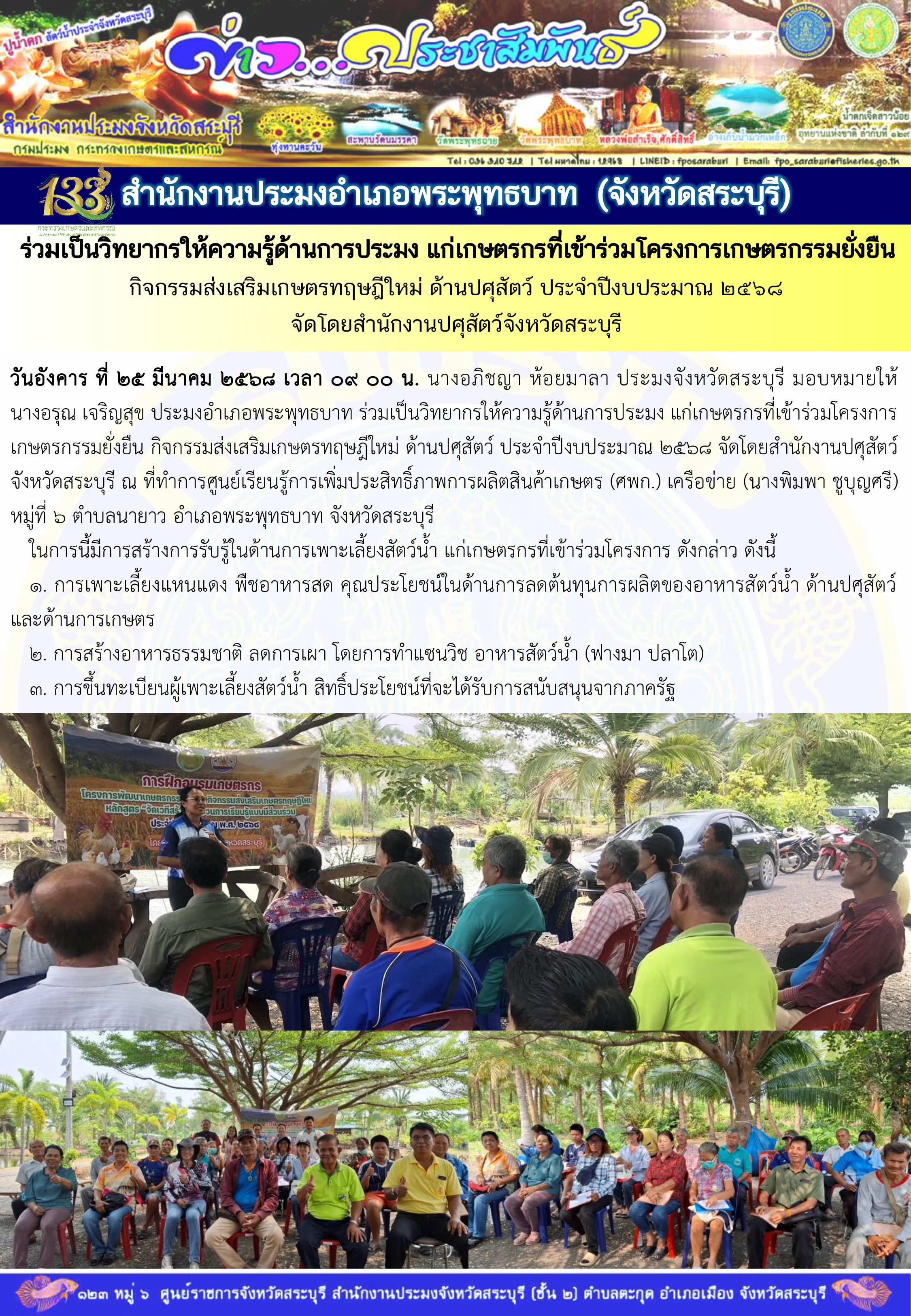 สำนักงานประมงอำเภอพระพุทธบาท ร่วมเป็นวิทยากรให้ความรู้ด้านการประมง แก่เกษตรกรที่เข้าร่วมโครงการเกษตรกรรมยั่งยืน กิจกรรมส่งเสริมเกษตรทฤษฎีใหม่ ด้านปศุสัตว์ ประจำปีงบประมาณ 2568 จัดโดยสำนักงานปศุสัตว์จังหวัดสระบุรี