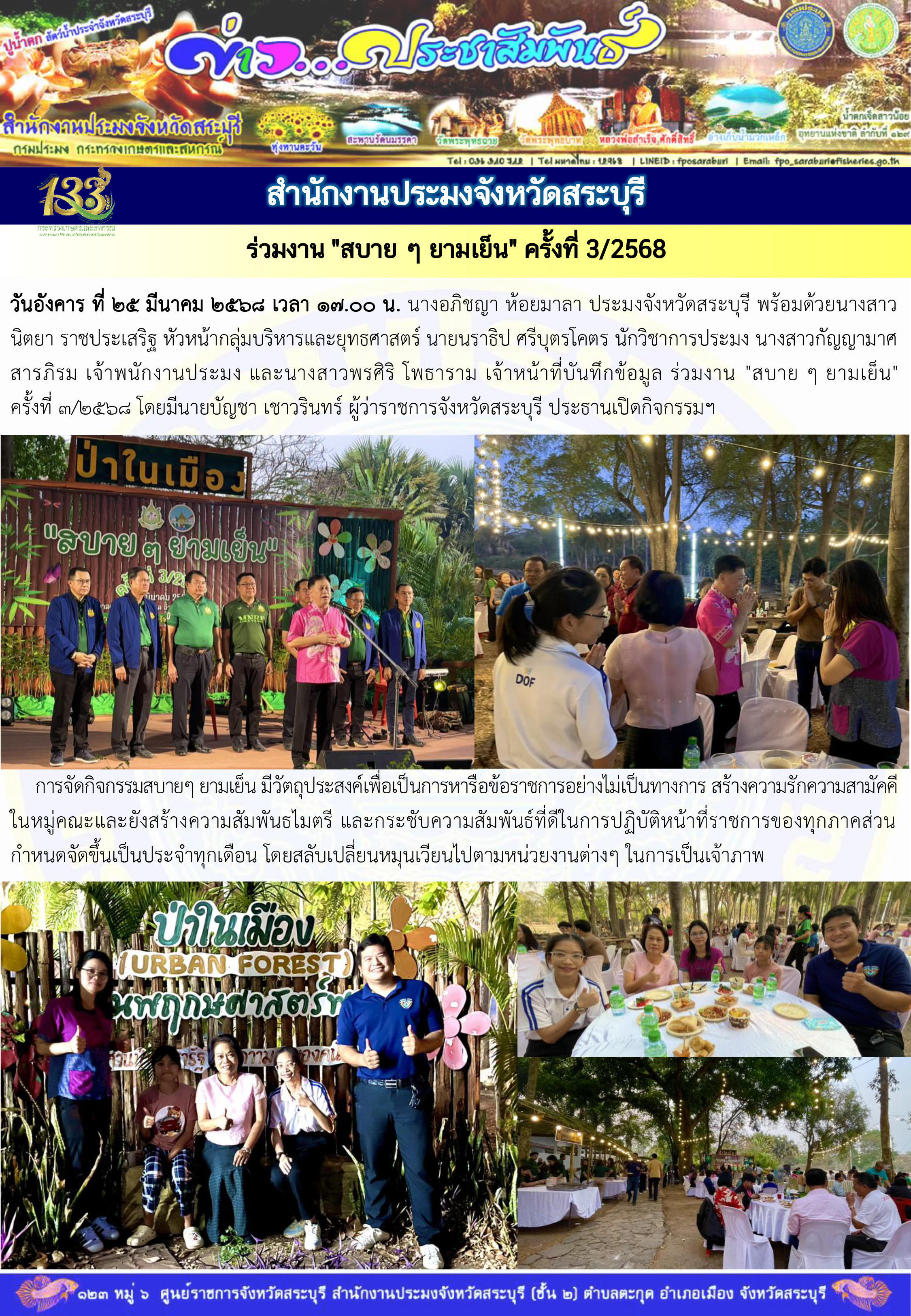 วันอังคาร ที่ 25 มีนาคม 2568 เวลา 17.00 น. นางอภิชญา ห้อยมาลา ประมงจังหวัดสระบุรี พร้อมด้วยนางสาวนิตยา ราชประเสริฐ หัวหน้ากลุ่มบริหารและยุทธศาสตร์ นายนราธิป ศรีบุตรโคตร นักวิชาการประมง นางสาวกัญญามาศ สารภิรม เจ้าพนักงานประมง และนางสาวพรศิริ โพธาราม เจ้าหน้าที่บันทึกข้อมูล ร่วมงาน "สบาย ๆ ยามเย็น" ครั้งที่ 3/2568 โดยมีนายบัญชา เชาวรินทร์ ผู้ว่าราชการจังหวัดสระบุรี ประธานเปิดกิจกรรมฯ