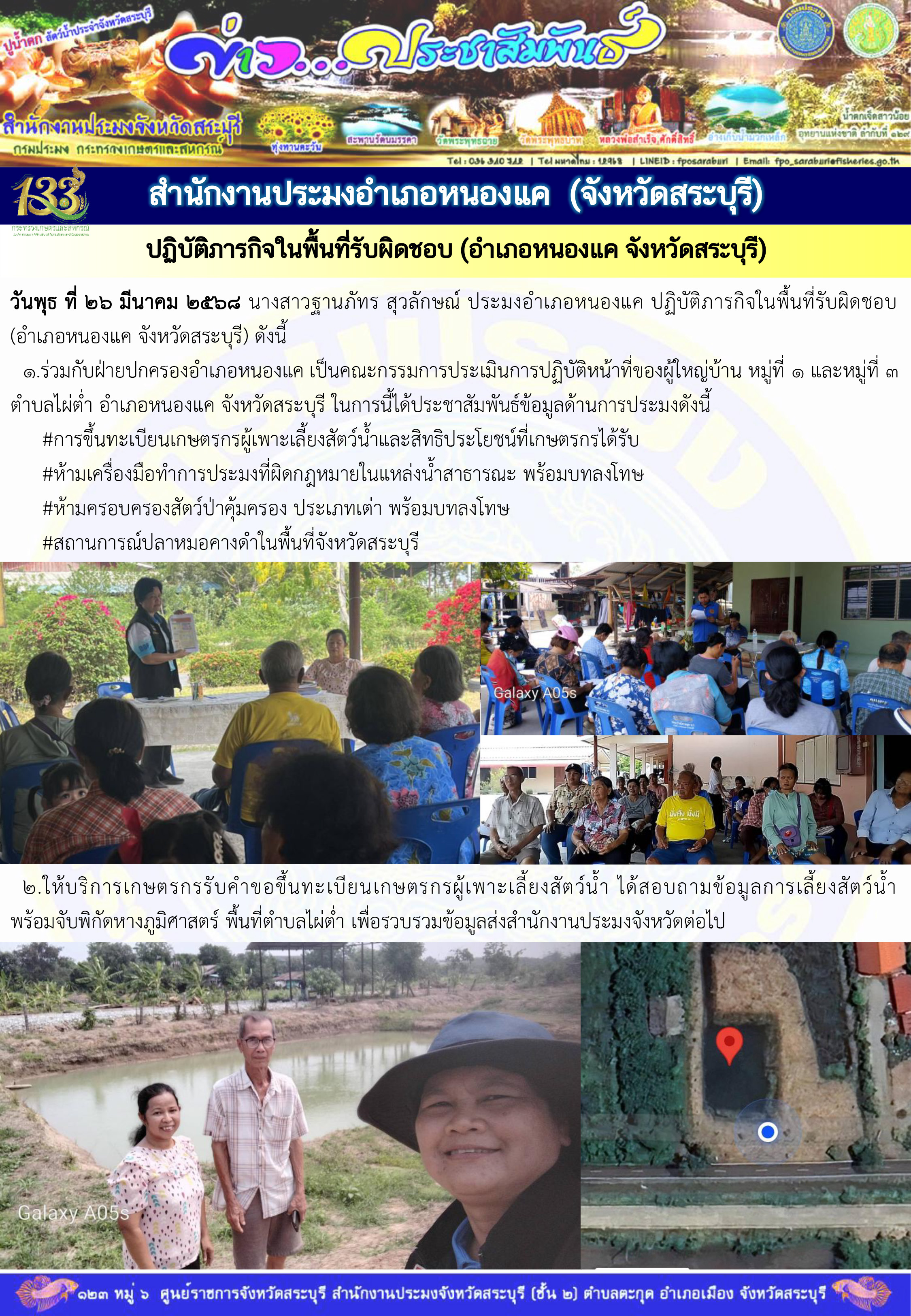 ภารกิจประจำวันที่ 26 มีนาคม 2568 สำนักงานประมงจังหวัดสระบุรี..คลิก