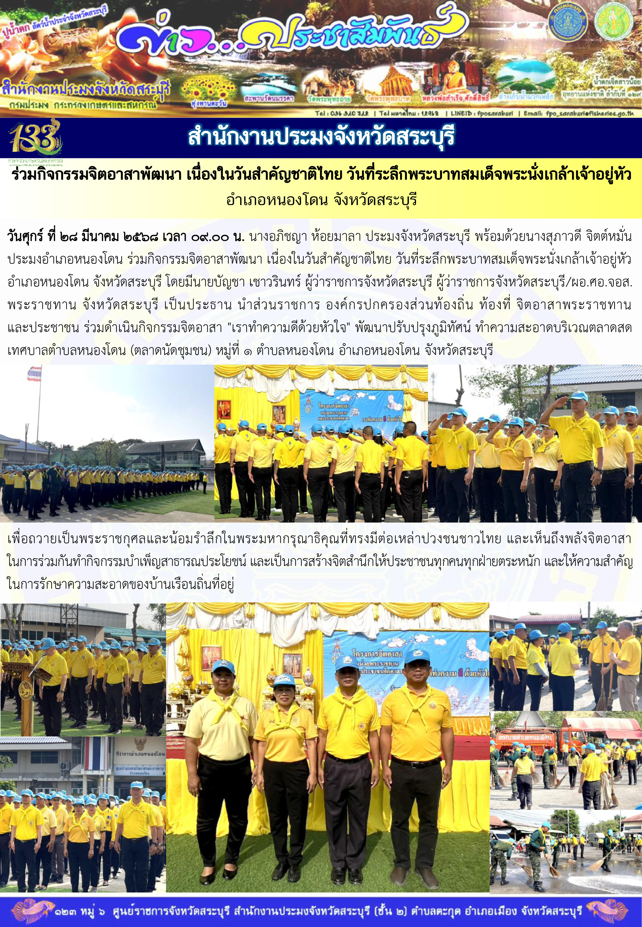 วันศุกร์ ที่ 28 มีนาคม 2568 เวลา 09.00 น. นางอภิชญา ห้อยมาลา ประมงจังหวัดสระบุรี พร้อมด้วยนางสุภาวดี จิตต์หมั่น ประมงอำเภอหนองโดน ร่วมกิจกรรมจิตอาสาพัฒนา เนื่องในวันสำคัญชาติไทย วันที่ระลึกพระบาทสมเด็จพระนั่งเกล้าเจ้าอยู่หัว อำเภอหนองโดน จังหวัดสระบุรี โดยมีนายบัญชา เชาวรินทร์ ผู้ว่าราชการจังหวัดสระบุรี ผู้ว่าราชการจังหวัดสระบุรี/ผอ.ศอ.จอส.พระราชทาน จังหวัดสระบุรี เป็นประธาน นำส่วนราชการ องค์กรปกครองส่วนท้องถิ่น ท้องที่ จิตอาสาพระราชทาน และประชาชน ร่วมดำเนินกิจกรรมจิตอาสา "เราทำความดีด้วยหัวใจ" พัฒนาปรับปรุงภูมิทัศน์ ทำความสะอาดบริเวณตลาดสดเทศบาลตำบลหนองโดน (ตลาดนัดชุมชน) หมู่ที่ 1 ตำบลหนองโดน อำเภอหนองโดน จังหวัดสระบุรี เพื่อถวายเป็นพระราชกุศลและน้อมรำลึกในพระมหากรุณาธิคุณที่ทรงมีต่อเหล่าปวงชนชาวไทย และเห็นถึงพลังจิตอาสาในการร่วมกันทำกิจกรรมบำเพ็ญสาธารณประโยชน์ และเป็นการสร้างจิตสำนึกให้ประชาชนทุกคนทุกฝ่าย ตระหนักและให้ความสำคัญในการรักษาความสะอาดของบ้านเรือนถิ่นที่อยู่