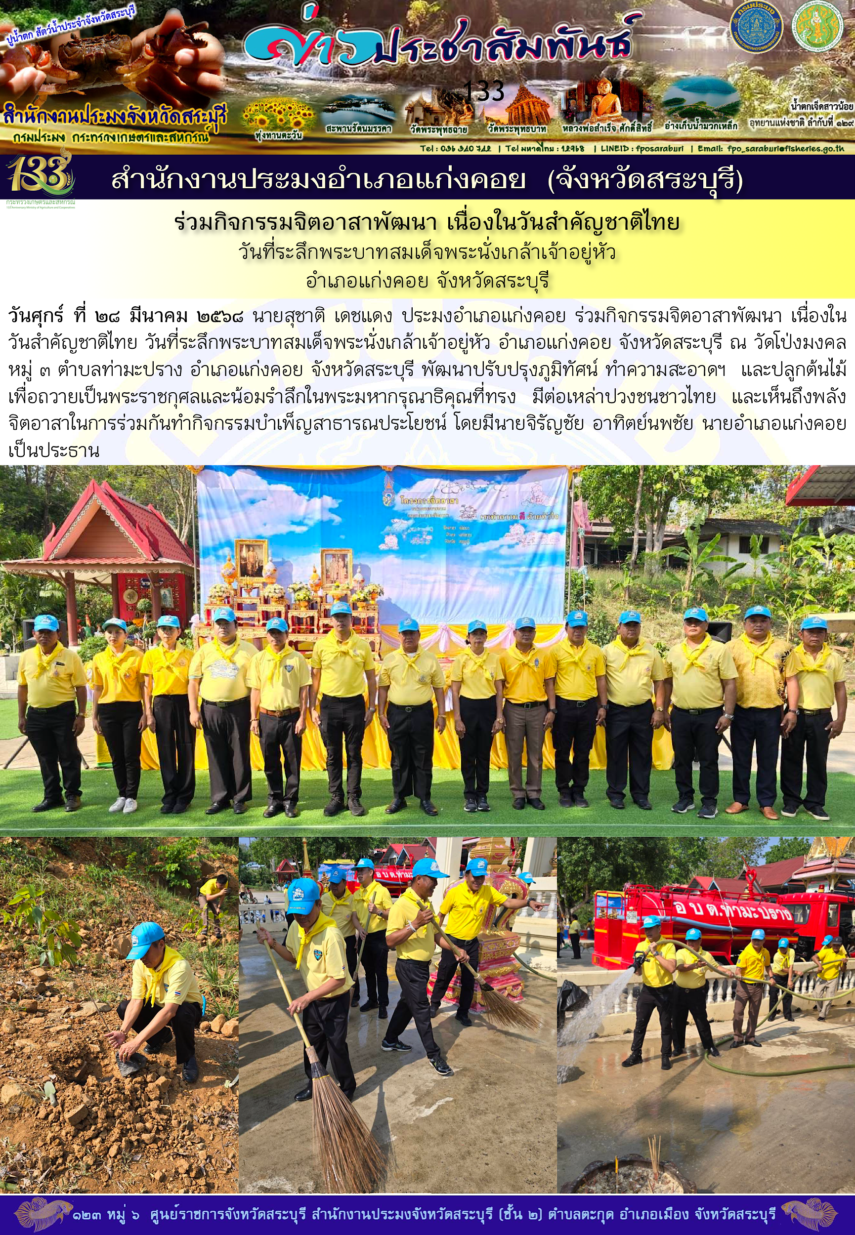 วันศุกร์ ที่ ๒๘ มีนาคม ๒๕๖๘ นายสุชาติ เดชแดง ประมงอำเภอแก่งคอย ร่วมกิจกรรมจิตอาสาพัฒนา เนื่องใน วันสำคัญชาติไทย วันที่ระลึกพระบาทสมเด็จพระนั่งเกล้าเจ้าอยู่หัว อำเภอแก่งคอย จังหวัดสระบุรี ณ วัดโป่งมงคล หมู่ ๓ ตำบลท่ามะปราง อำเภอแก่งคอย จังหวัดสระบุรี พัฒนาปรับปรุงภูมิทัศน์ ทำความสะอาดฯ  และปลูกต้นไม้ เพื่อถวายเป็นพระราชกุศลและน้อมรำลึกในพระมหากรุณาธิคุณที่ทรง มีต่อเหล่าปวงชนชาวไทย และเห็นถึงพลัง จิตอาสาในการร่วมกันทำกิจกรรมบำเพ็ญสาธารณประโยชน์ โดยมีนายจิรัญชัย อาทิตย์นพชัย นายอำเภอแก่งคอย เป็นประธาน
