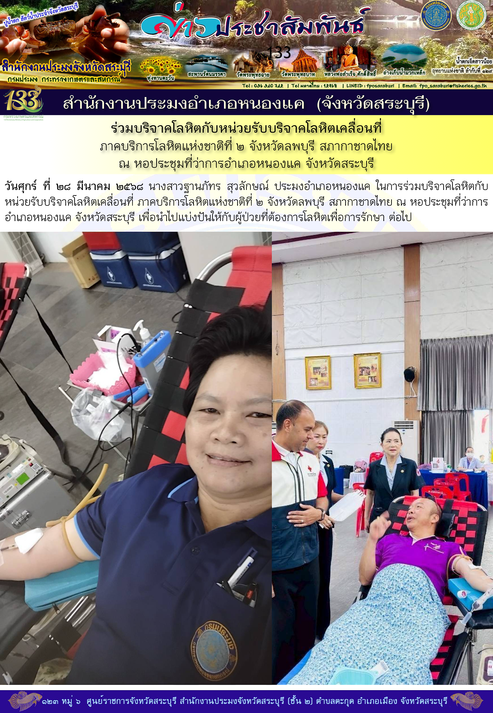 วันศุกร์ ที่ ๒๘ มีนาคม ๒๕๖๘ นางสาวฐานภัทร สุวลักษณ์ ประมงอำเภอหนองแค ในการร่วมบริจาคโลหิตกับหน่วยรับบริจาคโลหิตเคลื่อนที่ ภาคบริการโลหิตแห่งชาติที่ ๒ จังหวัดลพบุรี สภากาชาดไทย ณ หอประชุมที่ว่าการอำเภอหนองแค จังหวัดสระบุรี เพื่อนำไปแบ่งปันให้กับผู้ป่วยที่ต้องการโลหิตเพื่อการรักษา ต่อไป