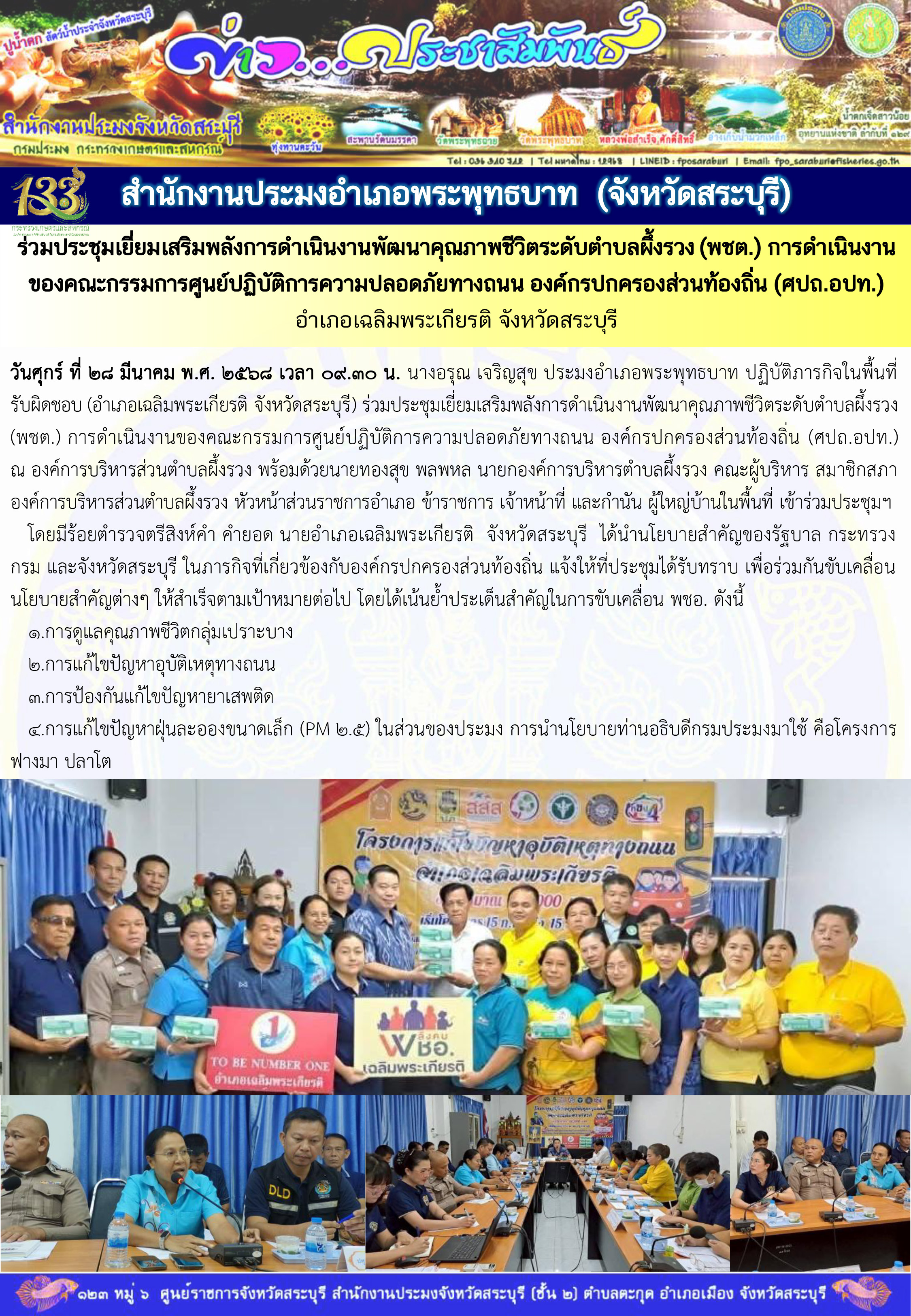 สำนักงานประมงอำเภอพระพุทธบาท ร่วมประชุมเยี่ยมเสริมพลังการดำเนินงานพัฒนาคุณภาพชีวิตระดับตำบลผึ้งรวง (พชต.) การดำเนินงานของคณะกรรมการศูนย์ปฏิบัติการความปลอดภัยทางถนน องค์กรปกครองส่วนท้องถิ่น (ศปถ.อปท.) อำเภอเฉลิมพระเกียรติ จังหวัดสระบุรี