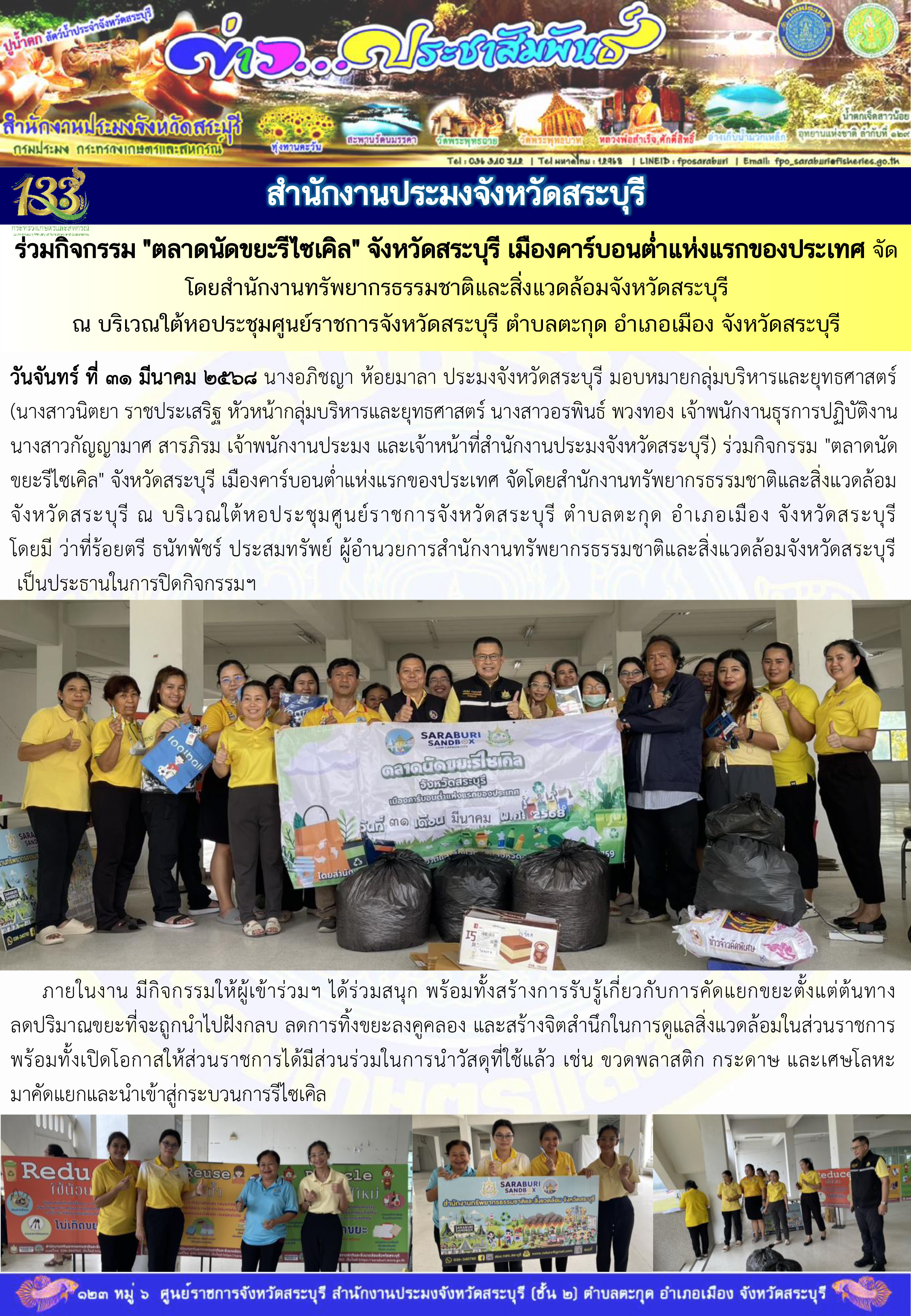 วันจันทร์ ที่ 31 มีนาคม 2568 นางอภิชญา ห้อยมาลา ประมงจังหวัดสระบุรี มอบหมายกลุ่มบริหารและยุทธศาสตร์ (นางสาวนิตยา ราชประเสริฐ หัวหน้ากลุ่มบริหารและยุทธศาสตร์ นางสาวอรพินธ์ พวงทอง เจ้าพนักงานธุรการปฏิบัติงาน นางสาวกัญญามาศ สารภิรม เจ้าพนักงานประมง และเจ้าหน้าที่สำนักงานประมงจังหวัดสระบุรี) ร่วมกิจกรรม "ตลาดนัดขยะรีไซเคิล" จังหวัดสระบุรี เมืองคาร์บอนต่ำแห่งแรกของประเทศ จัดโดยสำนักงานทรัพยากรธรรมชาติและสิ่งแวดล้อมจังหวัดสระบุรี ณ บริเวณใต้หอประชุมศูนย์ราชการจังหวัดสระบุรี ตำบลตะกุด อำเภอเมือง จังหวัดสระบุรี โดยมี ว่าที่ร้อยตรี ธนัทพัชร์ ประสมทรัพย์ ผู้อำนวยการสำนักงานทรัพยากรธรรมชาติและสิ่งแวดล้อมจังหวัดสระบุรี เป็นประธานในการปิดกิจกรรมฯ