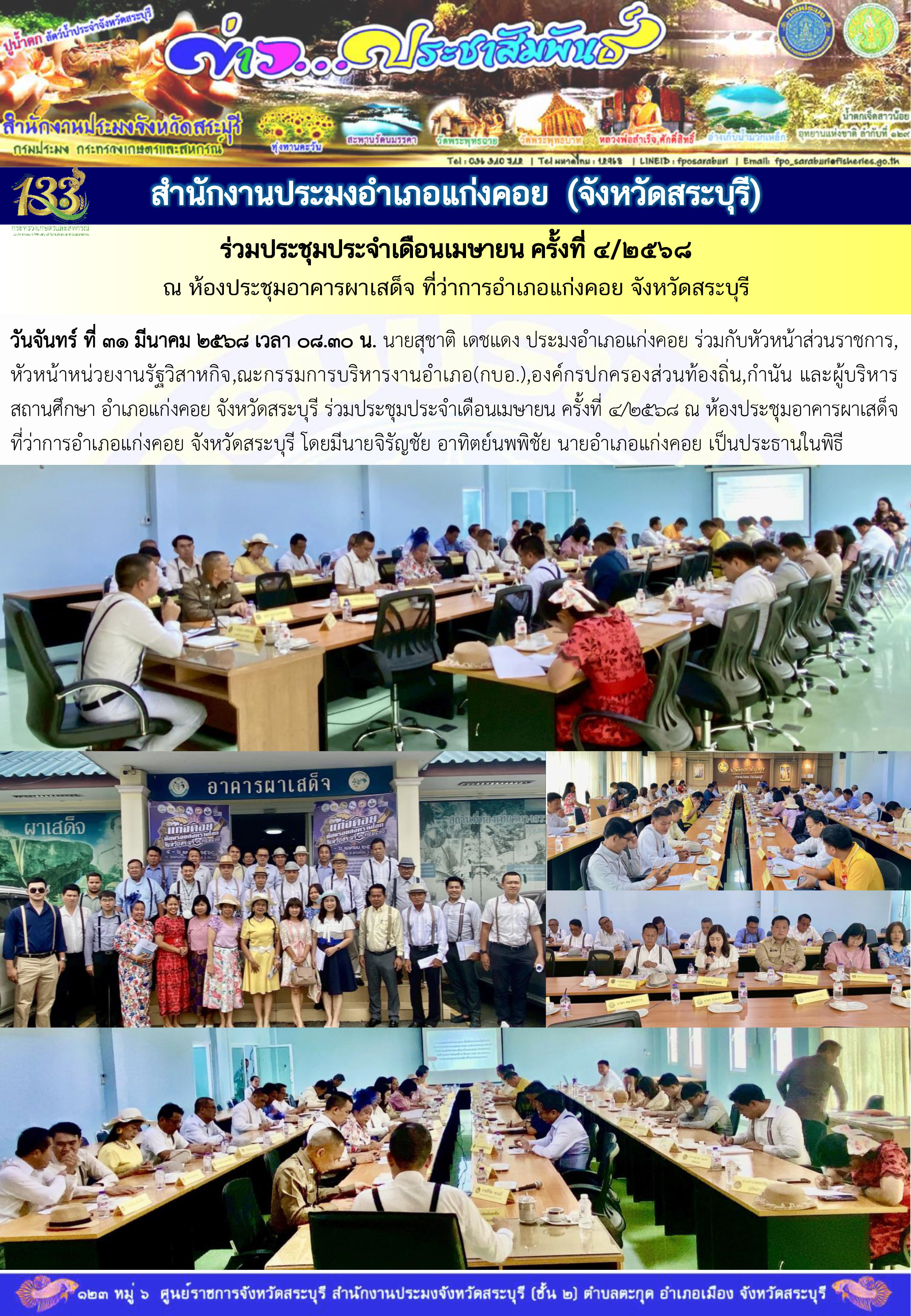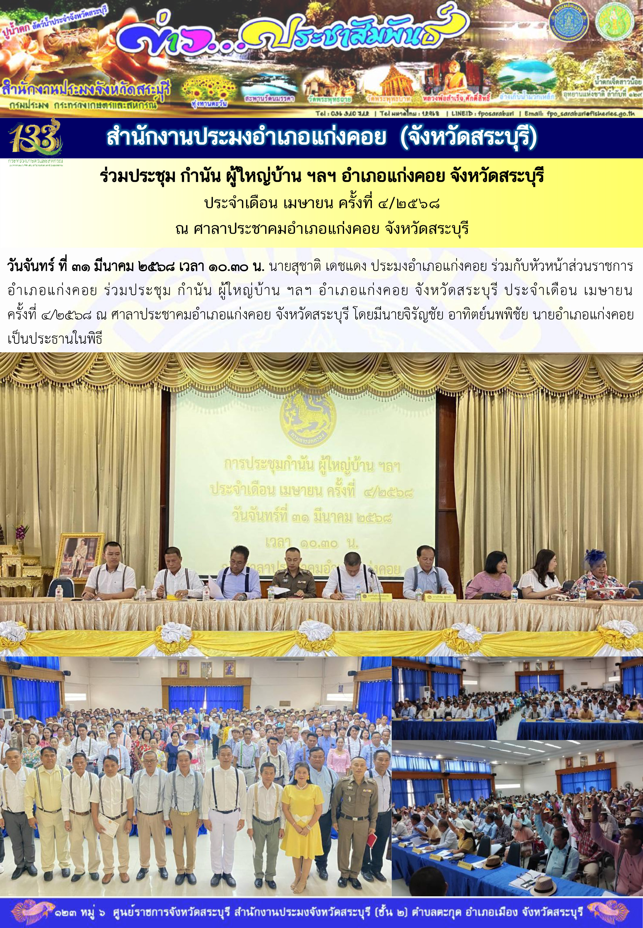 สำนักงานประมงอำเภอแก่งคอย ร่วมประชุม กำนัน ผู้ใหญ่บ้าน ฯลฯ อำเภอแก่งคอย จังหวัดสระบุรี ประจำเดือน เมษายน ครั้งที่ 4/2568 ณ ศาลาประชาคมอำเภอแก่งคอย จังหวัดสระบุรี