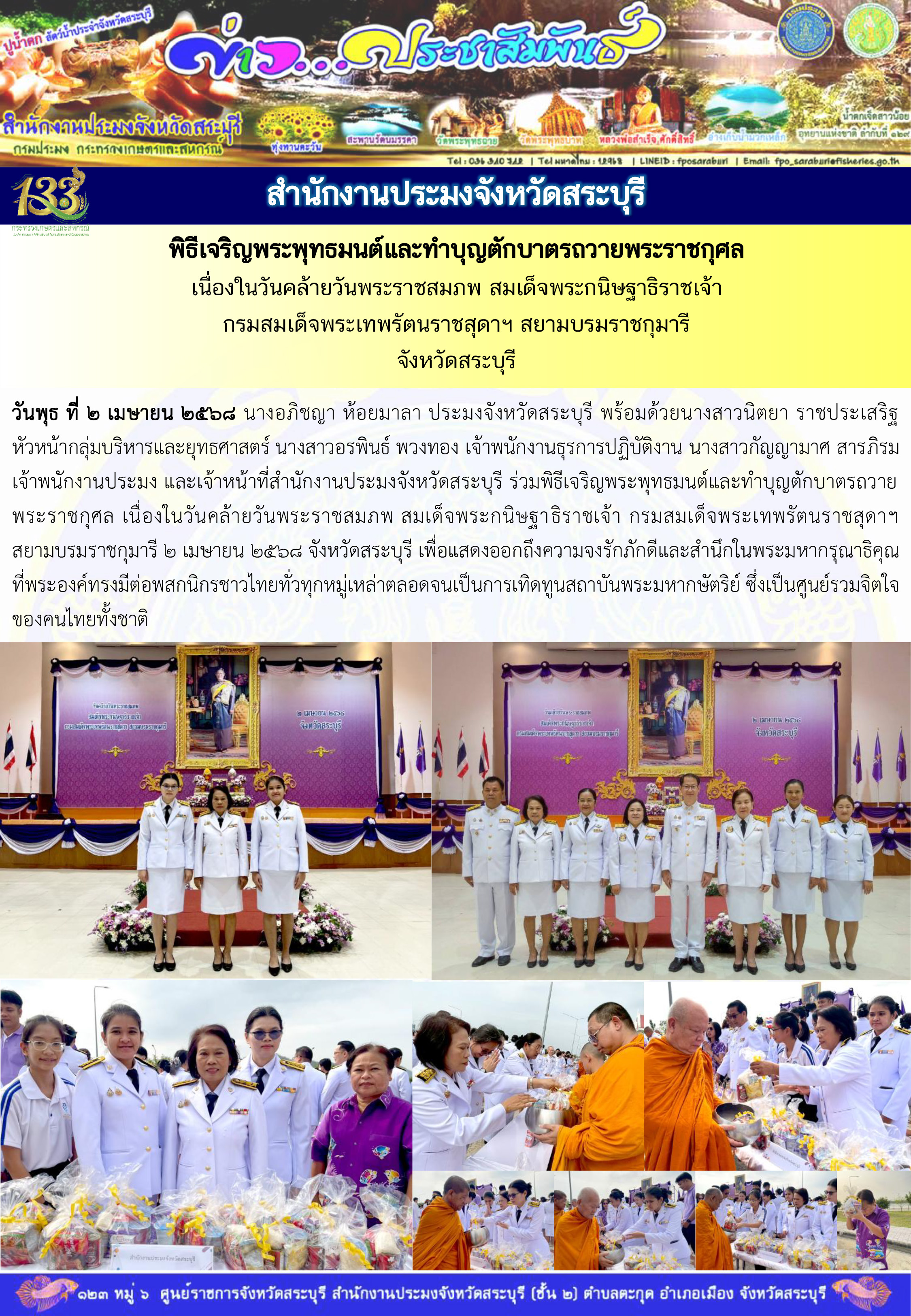 สำนักงานประมงจังหวัดสระบุรี ร่วมพิธีเจริญพระพุทธมนต์และทำบุญตักบาตรถวายพระราชกุศล เนื่องในวันคล้ายวันพระราชสมภพ สมเด็จพระกนิษฐาธิราชเจ้า กรมสมเด็จพระเทพรัตนราชสุดาฯ สยามบรมราชกุมารี 2 เมษายน 2568 จังหวัดสระบุรี