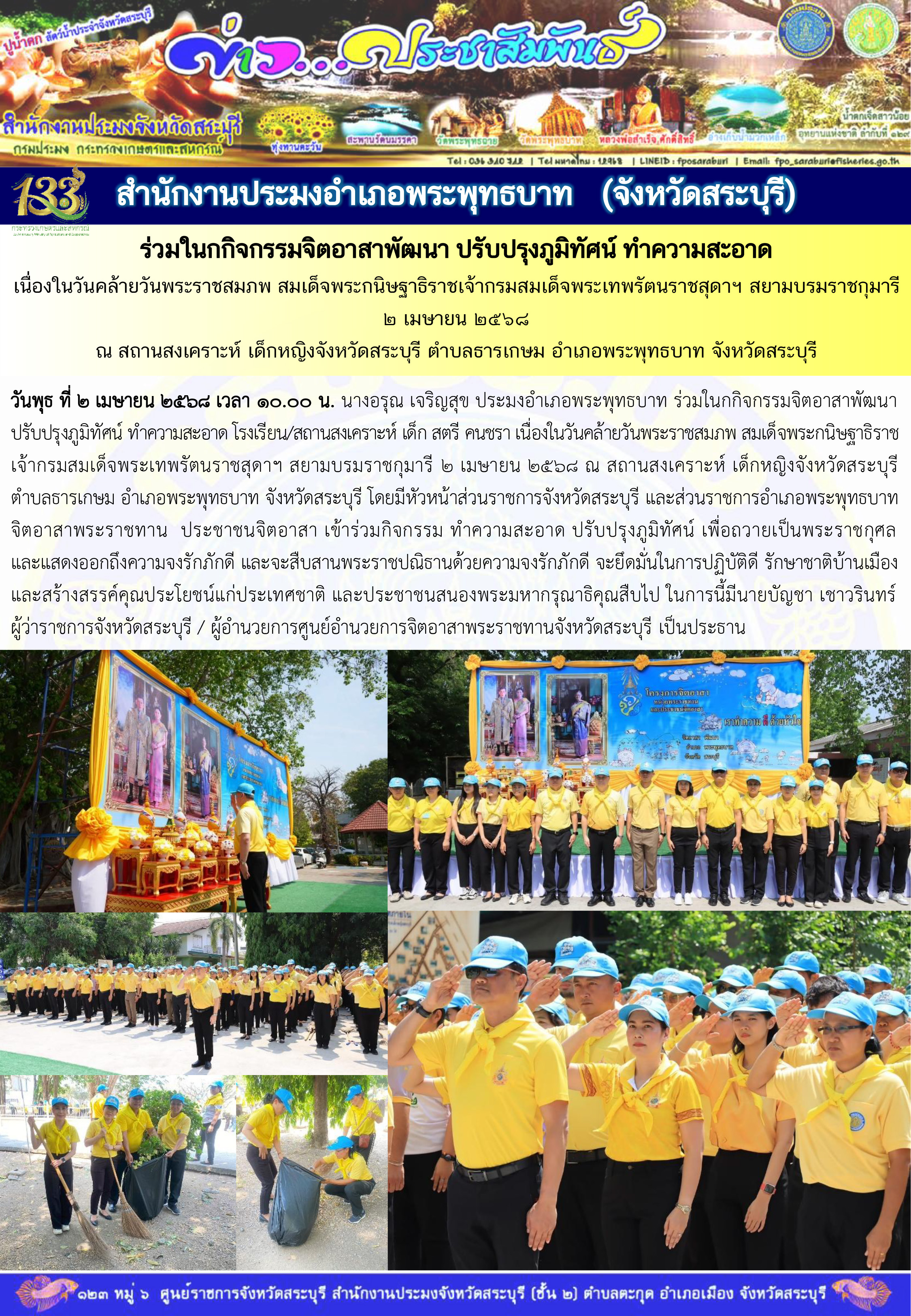 วันพุธ ที่ 2 เมษายน 2568 เวลา 10.00 น. นางอรุณ เจริญสุข ประมงอำเภอพระพุทธบาท ร่วมในกกิจกรรมจิตอาสาพัฒนา ปรับปรุงภูมิทัศน์ ทำความสะอาด โรงเรียน/สถานสงเคราะห์ เด็ก สตรี คนชรา เนื่องในวันคล้ายวันพระราชสมภพ สมเด็จพระกนิษฐาธิราชเจ้ากรมสมเด็จพระเทพรัตนราชสุดาฯ สยามบรมราชกุมารี 2 เมษายน 2568 ณ สถานสงเคราะห์ เด็กหญิงจังหวัดสระบุรี ตำบลธารเกษม อำเภอพระพุทธบาท จังหวัดสระบุรี โดยมีหัวหน้าส่วนราชการจังหวัดสระบุรี และส่วนราชการอำเภอพระพุทธบาท จิตอาสาพระราชทาน  ประชาชนจิตอาสา เข้าร่วมกิจกรรม ทำความสะอาด ปรับปรุงภูมิทัศน์ เพื่อถวายเป็นพระราชกุศล และแสดงออกถึงความจงรักภักดี และจะสืบสานพระราชปณิธานด้วยความจงรักภักดี จะยึดมั่นในการปฏิบัติดี รักษาชาติบ้านเมือง และสร้างสรรค์คุณประโยชน์แก่ประเทศชาติ และประชาชนสนองพระมหากรุณาธิคุณสืบไป ในการนี้มีนายบัญชา เชาวรินทร์ ผู้ว่าราชการจังหวัดสระบุรี / ผู้อำนวยการศูนย์อำนวยการจิตอาสาพระราชทานจังหวัดสระบุรี เป็นประธาน