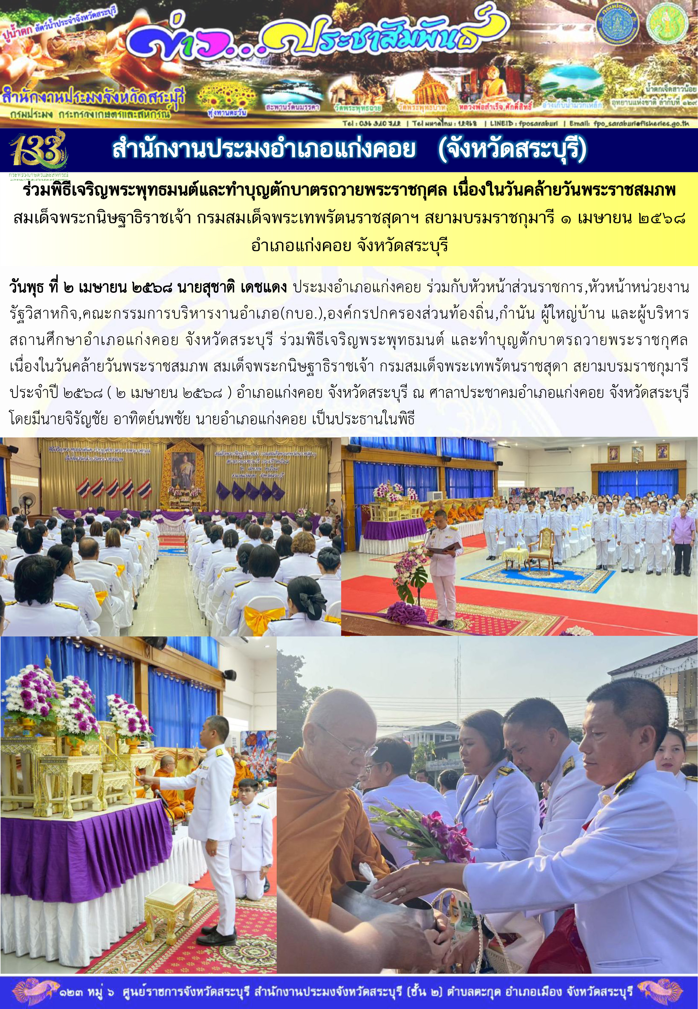สำนักงานประมงอำเภอแก่งคอย ร่วมพิธีเจริญพระพุทธมนต์และทำบุญตักบาตรถวายพระราชกุศล เนื่องในวันคล้ายวันพระราชสมภพ สมเด็จพระกนิษฐาธิราชเจ้า กรมสมเด็จพระเทพรัตนราชสุดาฯ สยามบรมราชกุมารี 2 เมษายน 2568 อำเภอแก่งคอย จังหวัดสระบุรี