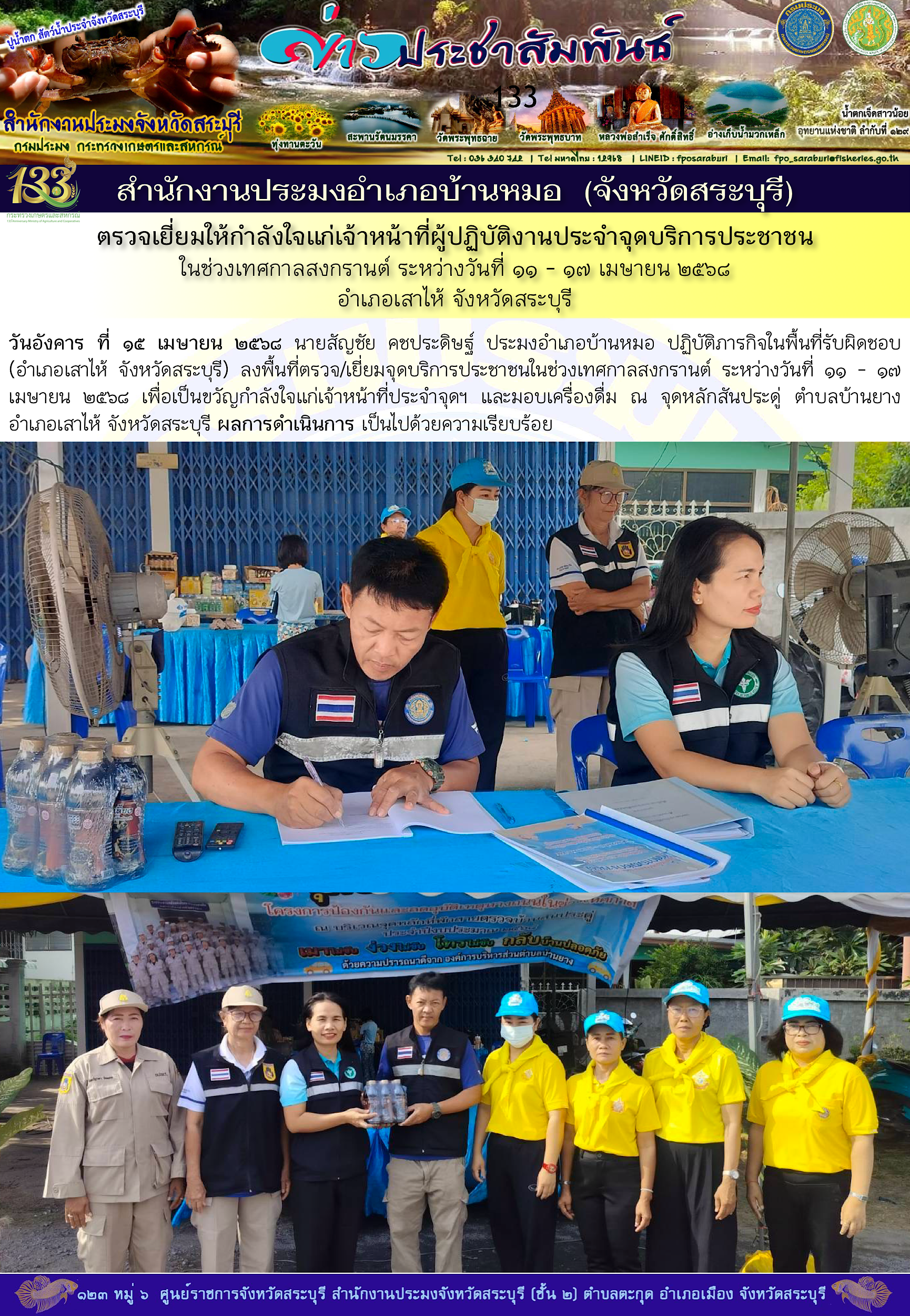สำนักงานประมงอำเภอบ้านหมอ ตรวจเยี่ยมให้กำลังใจแก่เจ้าหน้าที่ผู้ปฏิบัติงานประจำจุดบริการประชาชน ในช่วงเทศกาลสงกรานต์ ระหว่างวันที่ ๑๑ - ๑๗ เมษายน ๒๕๖๘ อำเภอเสาไห้ จังหวัดสระบุรี