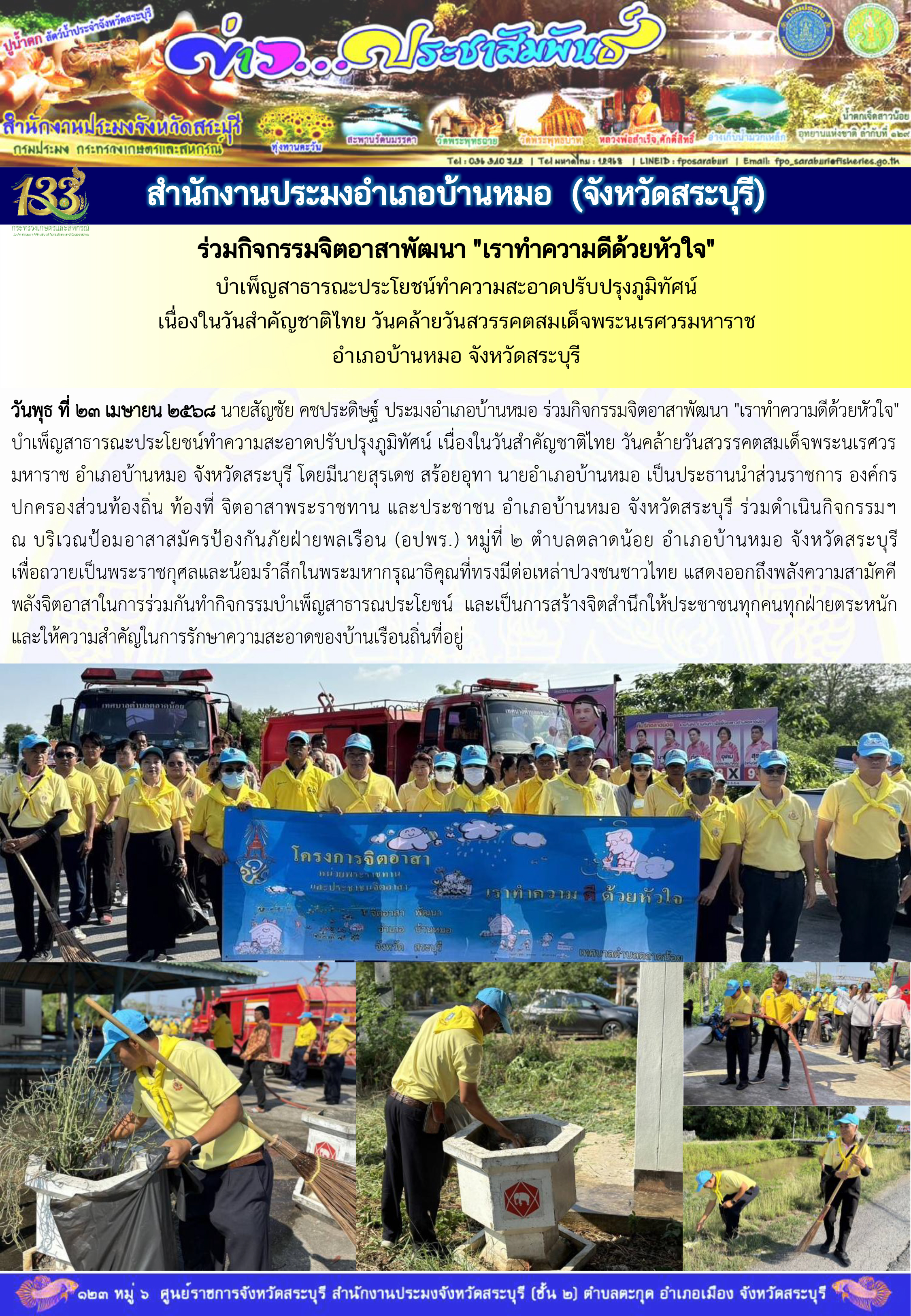 วันพุธ ที่ 23 เมษายน 2568 นายสัญชัย คชประดิษฐ์ ประมงอำเภอบ้านหมอ ร่วมกิจกรรมจิตอาสาพัฒนา "เราทำความดีด้วยหัวใจ" บำเพ็ญสาธารณะประโยชน์ทำความสะอาดปรับปรุงภูมิทัศน์ เนื่องในวันสำคัญชาติไทย วันคล้ายวันสวรรคตสมเด็จพระนเรศวรมหาราช อำเภอบ้านหมอ จังหวัดสระบุรี โดยมีนายสุรเดช สร้อยอุทา นายอำเภอบ้านหมอ เป็นประธานนำส่วนราชการ องค์กรปกครองส่วนท้องถิ่น ท้องที่ จิตอาสาพระราชทาน และประชาชน อำเภอบ้านหมอ จังหวัดสระบุรี ร่วมดำเนินกิจกรรมฯ ณ บริเวณป้อมอาสาสมัครป้องกันภัยฝ่ายพลเรือน (อปพร.) หมู่ที่ 2 ตำบลตลาดน้อย อำเภอบ้านหมอ จังหวัดสระบุรี เพื่อถวายเป็นพระราชกุศลและน้อมรำลึกในพระมหากรุณาธิคุณที่ทรงมีต่อเหล่าปวงชนชาวไทย แสดงออกถึงพลังความสามัคคี พลังจิตอาสาในการร่วมกันทำกิจกรรมบำเพ็ญสาธารณประโยชน์ และเป็นการสร้างจิตสำนึกให้ประชาชนทุกคนทุกฝ่ายตระหนักและให้ความสำคัญในการรักษาความสะอาดของบ้านเรือนถิ่นที่อยู่