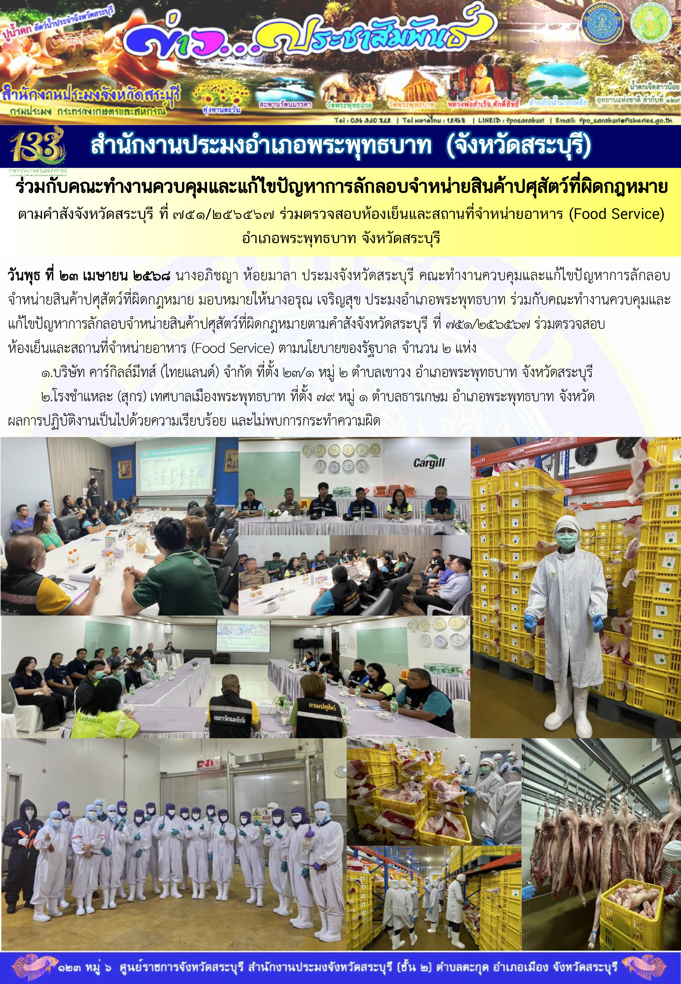 สำนักงานประมงอำเภอพระพุทธบาท ร่วมกับคณะทำงานควบคุมและแก้ไขปัญหาการลักลอบจำหน่ายสินค้าปศุสัตว์ที่ผิดกฎหมายตามคำสังจังหวัดสระบุรี ที่ ๗๕๑/๒๕๖๕๖๗ ร่วมตรวจสอบห้องเย็นและสถานที่จำหน่ายอาหาร (Food Service) อำเภอพระพุทธบาท จังหวัดสระบุรี