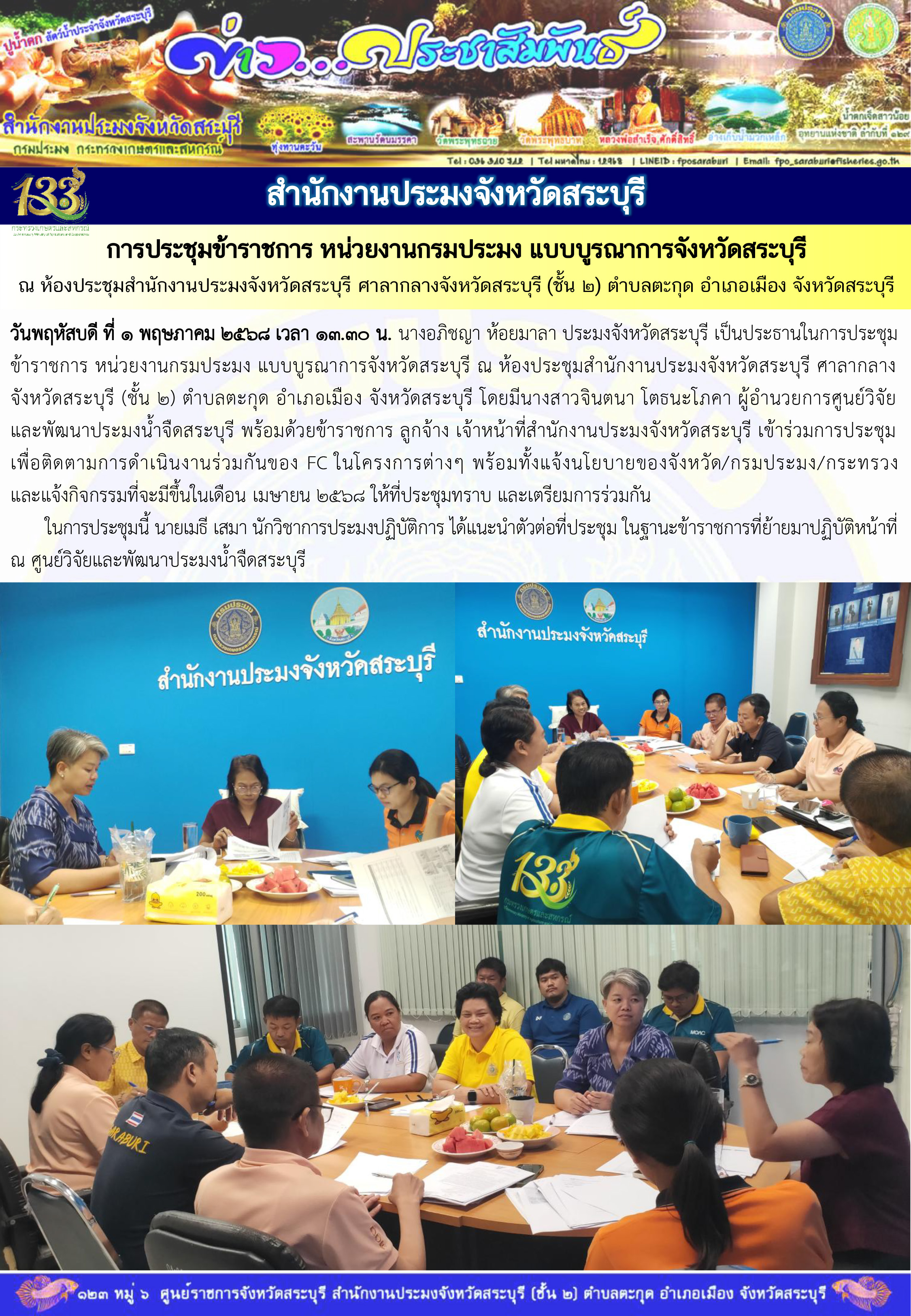 สำนักงานประมงจังหวัดสระบุรี การประชุมข้าราชการ หน่วยงานกรมประมง แบบบูรณาการจังหวัดสระบุรี ณ ห้องประชุมสำนักงานประมงจังหวัดสระบุรี ศาลากลางจังหวัดสระบุรี (ชั้น 2) ตำบลตะกุด อำเภอเมือง จังหวัดสระบุรี