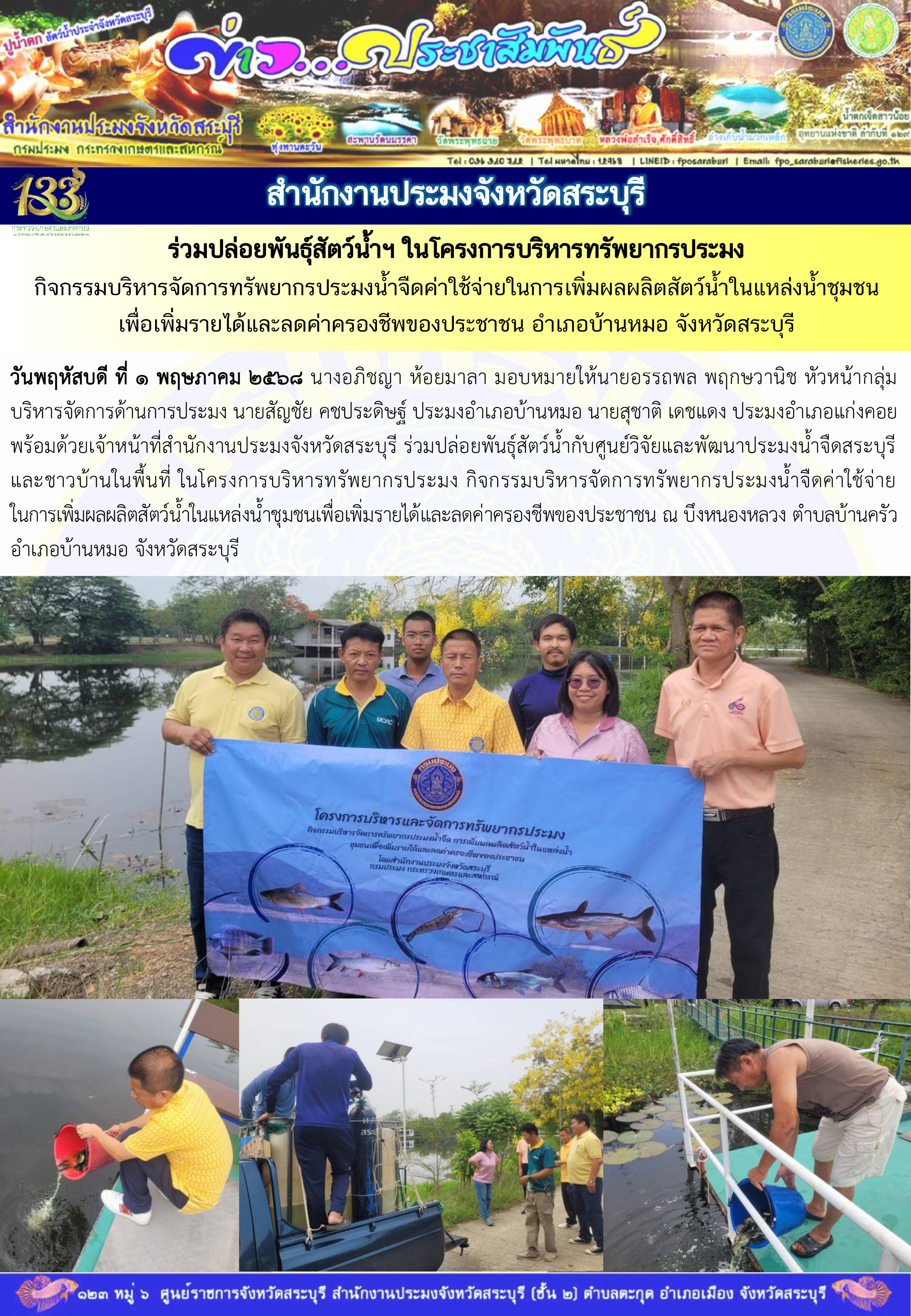 สำนักงานประมงจังหวัดสระบุรี ร่วมปล่อยพันธุ์สัตว์น้ำฯ ในโครงการบริหารทรัพยากรประมง กิจกรรมบริหารจัดการทรัพยากรประมงน้ำจืดค่าใช้จ่ายในการเพิ่มผลผลิตสัตว์น้ำในแหล่งน้ำชุมชนเพื่อเพิ่มรายได้และลดค่าครองชีพของประชาชน อำเภอบ้านหมอ จังหวัดสระบุรี