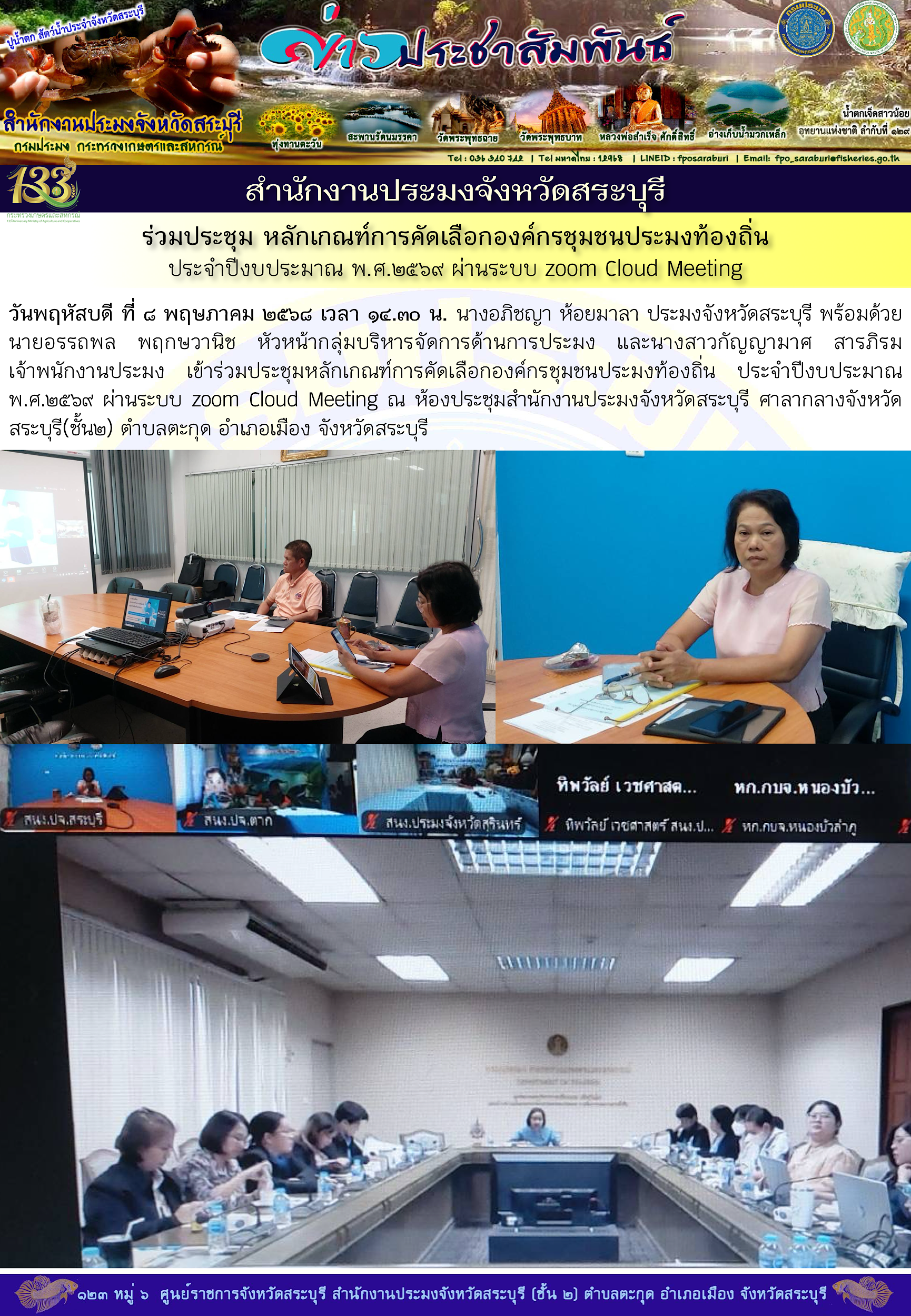 วันพฤหัสบดี ที่ ๘ พฤษภาคม ๒๕๖๘ เวลา ๑๔.๓๐ น. นางอภิชญา ห้อยมาลา ประมงจังหวัดสระบุรี พร้อมด้วย นายอรรถพล พฤกษวานิช หัวหน้ากลุ่มบริหารจัดการด้านการประมง และนางสาวกัญญามาศ สารภิรม เจ้าพนักงานประมง เข้าร่วมประชุมหลักเกณฑ์การคัดเลือกองค์กรชุมชนประมงท้องถิ่น ประจำปีงบประมาณ พ.ศ.๒๕๖๙ ผ่านระบบ zoom Cloud Meeting ณ ห้องประชุมสำนักงานประมงจังหวัดสระบุรี ศาลากลางจังหวัดสระบุรี(ชั้น๒) ตำบลตะกุด อำเภอเมือง จังหวัดสระบุรี