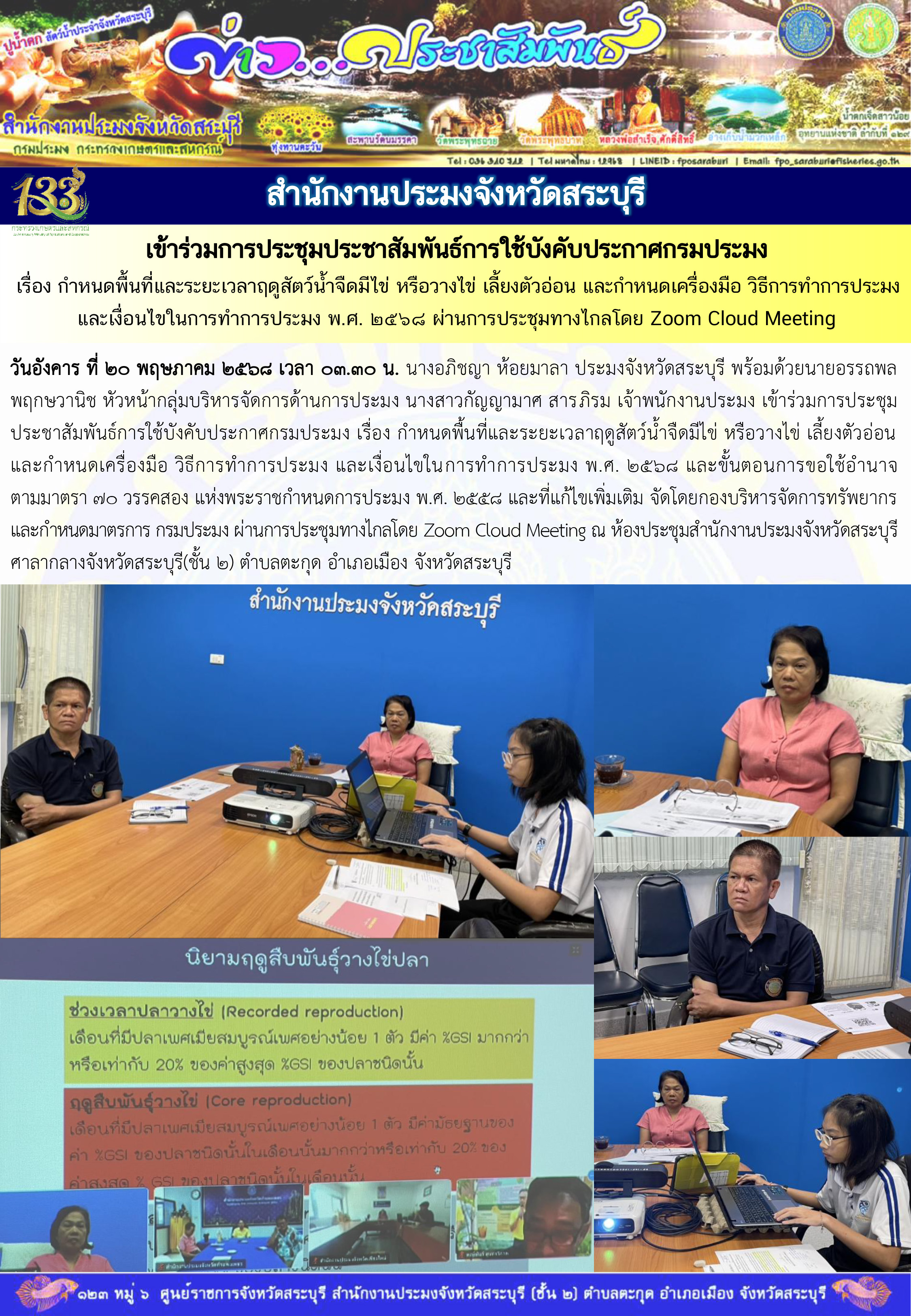 สำนักงานประมงจังหวัดสระบุรี เข้าร่วมการประชุมประชาสัมพันธ์การใช้บังคับประกาศกรมประมง เรื่อง กำหนดพื้นที่และระยะเวลาฤดูสัตว์น้ำจืดมีไข่ หรือวางไข่ เลี้ยงตัวอ่อน และกำหนดเครื่องมือ วิธีการทำการประมง และเงื่อนไขในการทำการประมง พ.ศ. ๒๕๖๘ ผ่านการประชุมทางไกลโดย Zoom Cloud Meeting