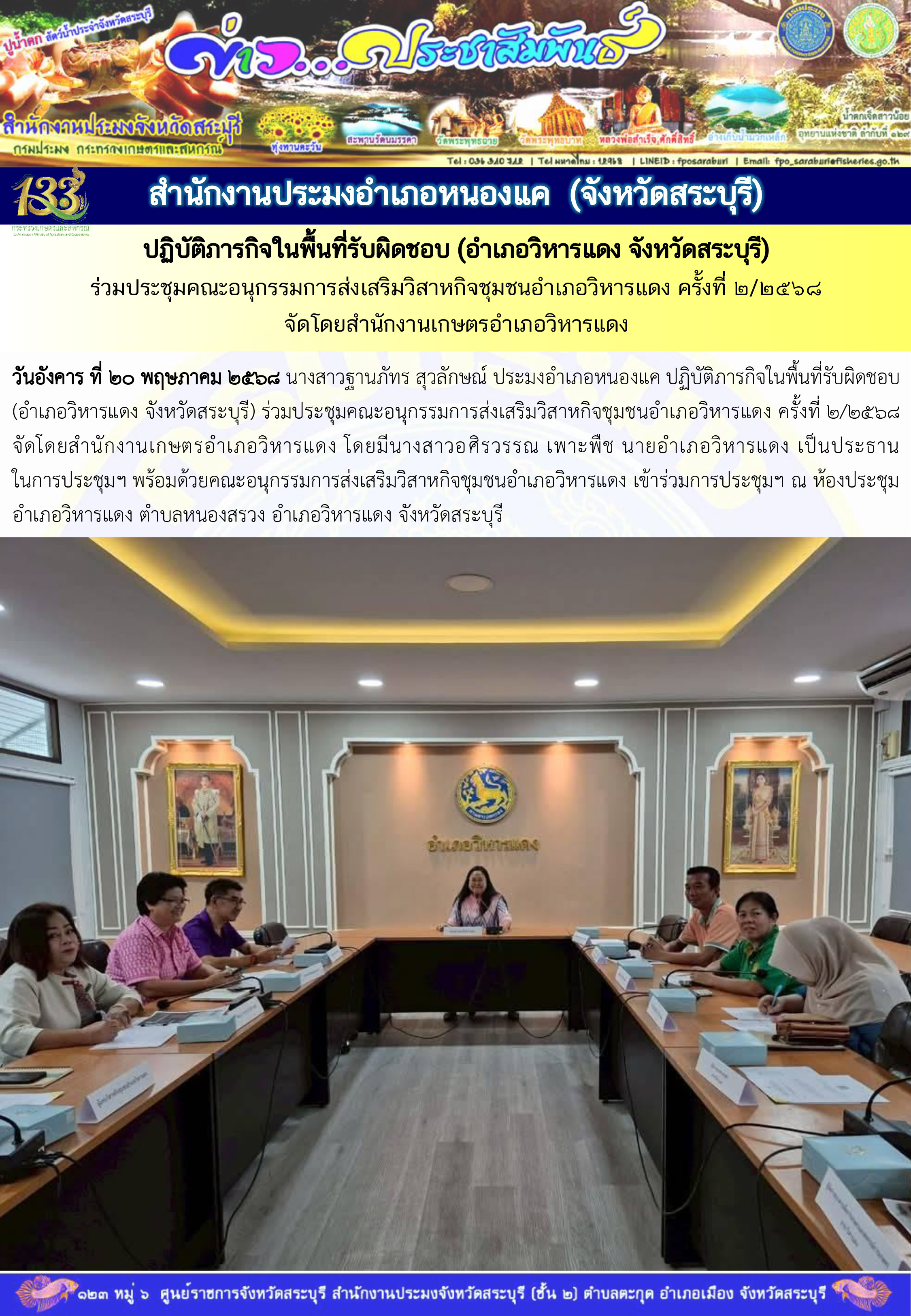วันอังคาร ที่ ๒๐ พฤษภาคม ๒๕๖๘ นางสาวฐานภัทร สุวลักษณ์ ประมงอำเภอหนองแค ปฏิบัติภารกิจในพื้นที่รับผิดชอบ (อำเภอวิหารแดง จังหวัดสระบุรี) ร่วมประชุมคณะอนุกรรมการส่งเสริมวิสาหกิจชุมชนอำเภอวิหารแดง ครั้งที่ ๒/๒๕๖๘ จัดโดยสำนักงานเกษตรอำเภอวิหารแดง โดยมีนางสาวอศิรวรรณ เพาะพืช นายอำเภอวิหารแดง เป็นประธานในการประชุมฯ พร้อมด้วยคณะอนุกรรมการส่งเสริมวิสาหกิจชุมชนอำเภอวิหารแดง เข้าร่วมการประชุมฯ ณ ห้องประชุมอำเภอวิหารแดง ตำบลหนองสรวง อำเภอวิหารแดง จังหวัดสระบุรี