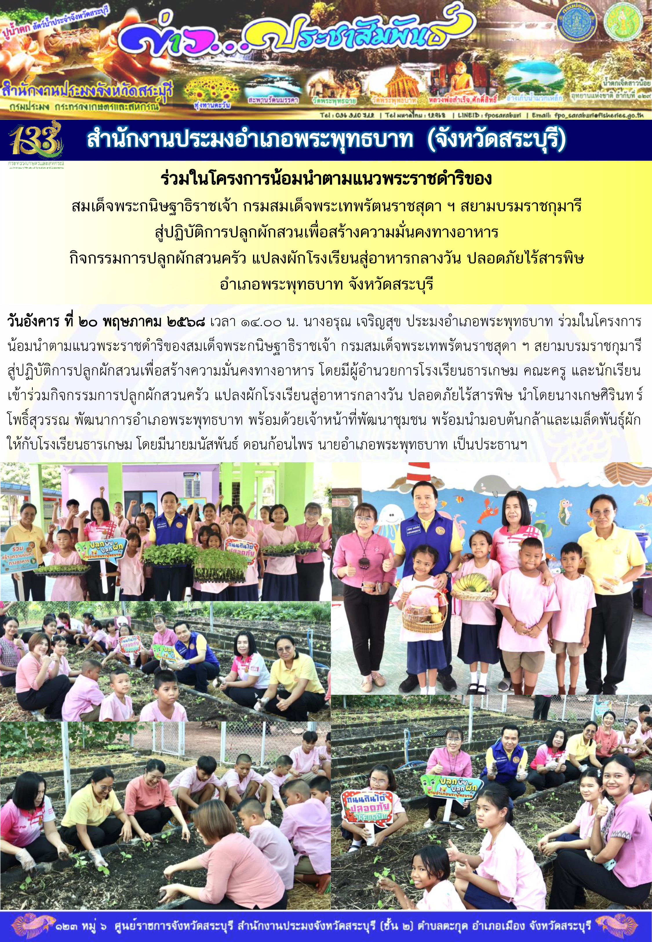 วันอังคาร ที่ ๒๐ พฤษภาคม ๒๕๖๘ เวลา ๑๔.๐๐ น. นางอรุณ เจริญสุข ประมงอำเภอพระพุทธบาท ร่วมในโครงการน้อมนำตามแนวพระราชดำริของสมเด็จพระกนิษฐาธิราชเจ้า กรมสมเด็จพระเทพรัตนราชสุดา ฯ สยามบรมราชกุมารี สู่ปฏิบัติการปลูกผักสวนเพื่อสร้างความมั่นคงทางอาหาร โดยมีผู้อำนวยการโรงเรียนธารเกษม คณะครู และนักเรียน เข้าร่วมกิจกรรมการปลูกผักสวนครัว แปลงผักโรงเรียนสู่อาหารกลางวัน ปลอดภัยไร้สารพิษ นำโดยนางเกษศิรินทร์ โพธิ์สุวรรณ พัฒนาการอำเภอพระพุทธบาท พร้อมด้วยเจ้าหน้าที่พัฒนาชุมชน พร้อมนำมอบต้นกล้าและเมล็ดพันธุ์ผักให้กับโรงเรียนธารเกษม โดยมีนายมนัสพันธ์ ดอนก้อนไพร นายอำเภอพระพุทธบาท เป็นประธานฯ