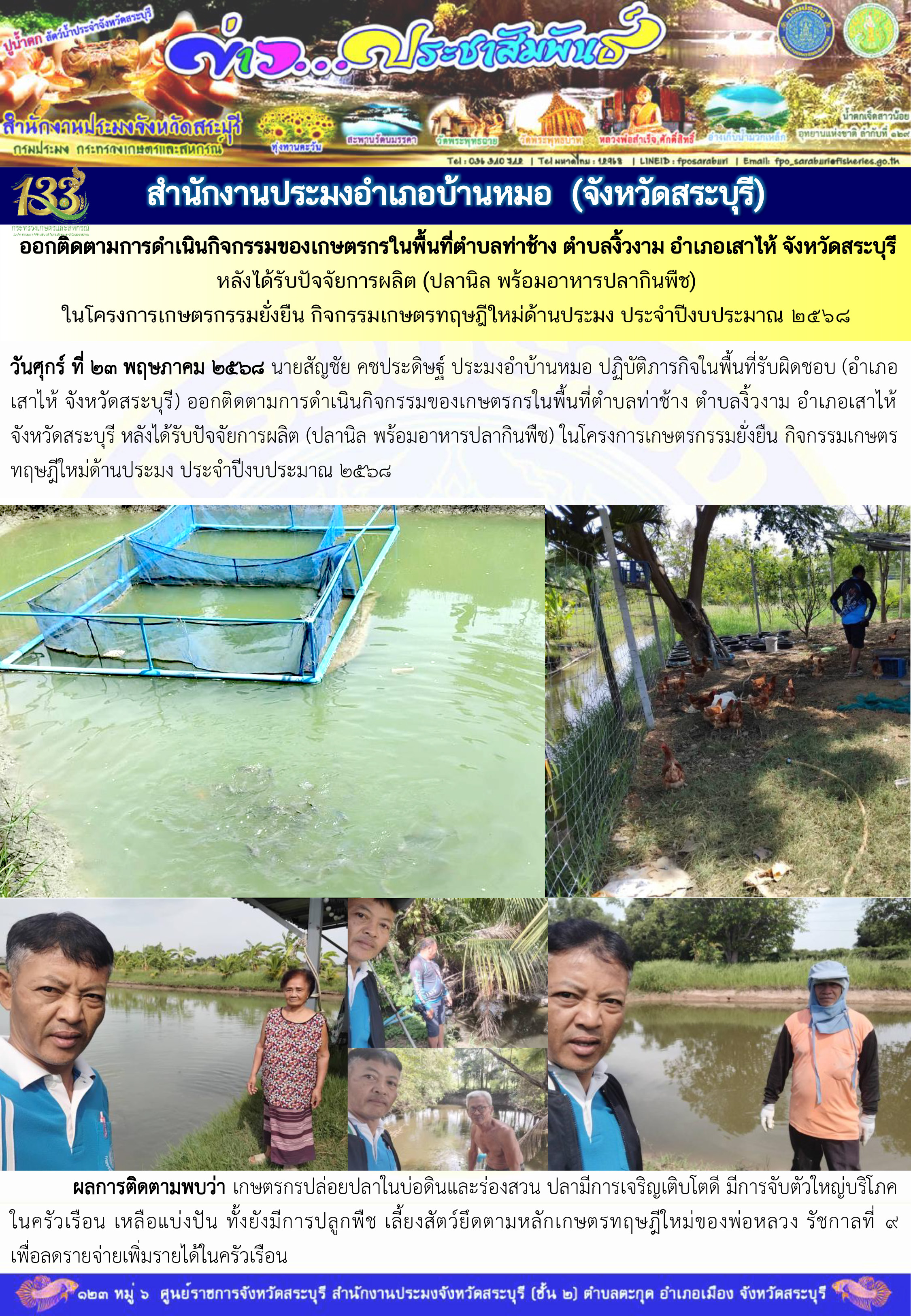 สำนักงานประมงอำเภอบ้านหมอ ออกติดตามการดำเนินกิจกรรมของเกษตรกรในพื้นที่ตำบลท่าช้าง ตำบลงิ้วงาม อำเภอเสาไห้ จังหวัดสระบุรี หลังได้รับปัจจัยการผลิต (ปลานิล พร้อมอาหารปลากินพืช) ในโครงการเกษตรกรรมยั่งยืน กิจกรรมเกษตรทฤษฎีใหม่ด้านประมง ประจำปีงบประมาณ ๒๕๖๘