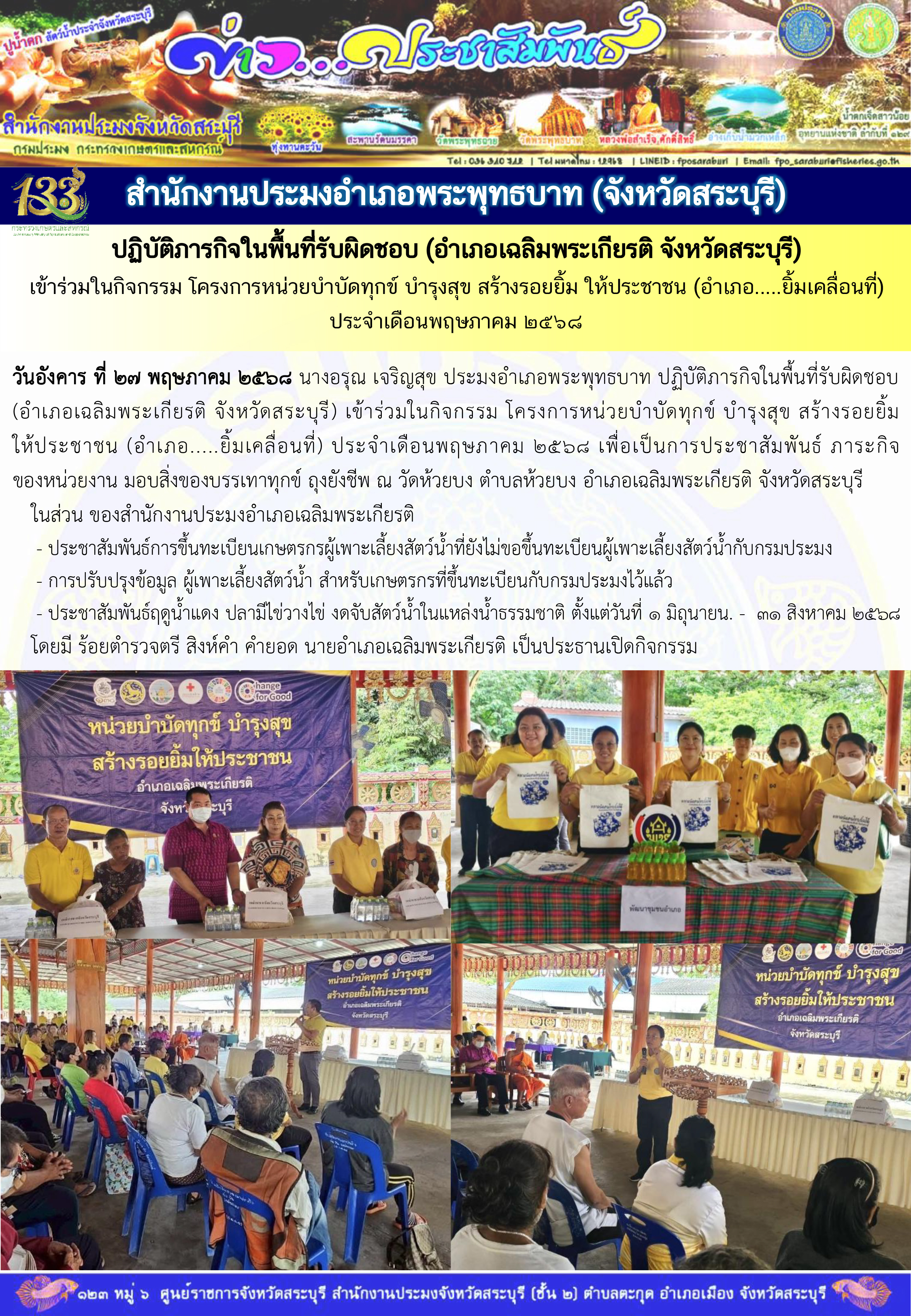 สำนักงานประมงอำเภอพระพุทธบาท ปฏิบัติภารกิจในพื้นที่รับผิดชอบ (อำเภอเฉลิมพระเกียรติ จังหวัดสระบุรี) เข้าร่วมในกิจกรรม โครงการหน่วยบำบัดทุกข์ บำรุงสุข สร้างรอยยิ้ม ให้ประชาชน (อำเภอ.....ยิ้มเคลื่อนที่) ประจำเดือนพฤษภาคม ๒๕๖๘