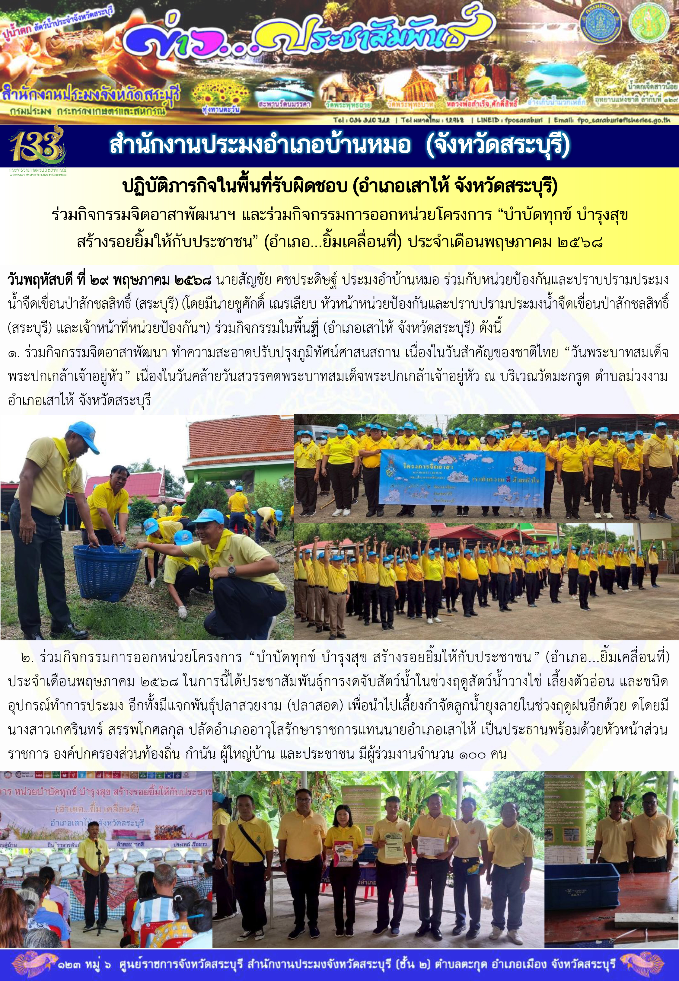 สำนักงานประมงอำเภอบ้านหมอ ปฏิบัติภารกิจในพื้นที่รับผิดชอบ (อำเภอเสาไห้ จังหวัดสระบุรี) ร่วมกิจกรรมจิตอาสาพัฒนาฯ และร่วมกิจกรรมการออกหน่วยโครงการ “บำบัดทุกข์ บำรุงสุข สร้างรอยยิ้มให้กับประชาชน” (อำเภอ...ยิ้มเคลื่อนที่) ประจำเดือนพฤษภาคม ๒๕๖๘