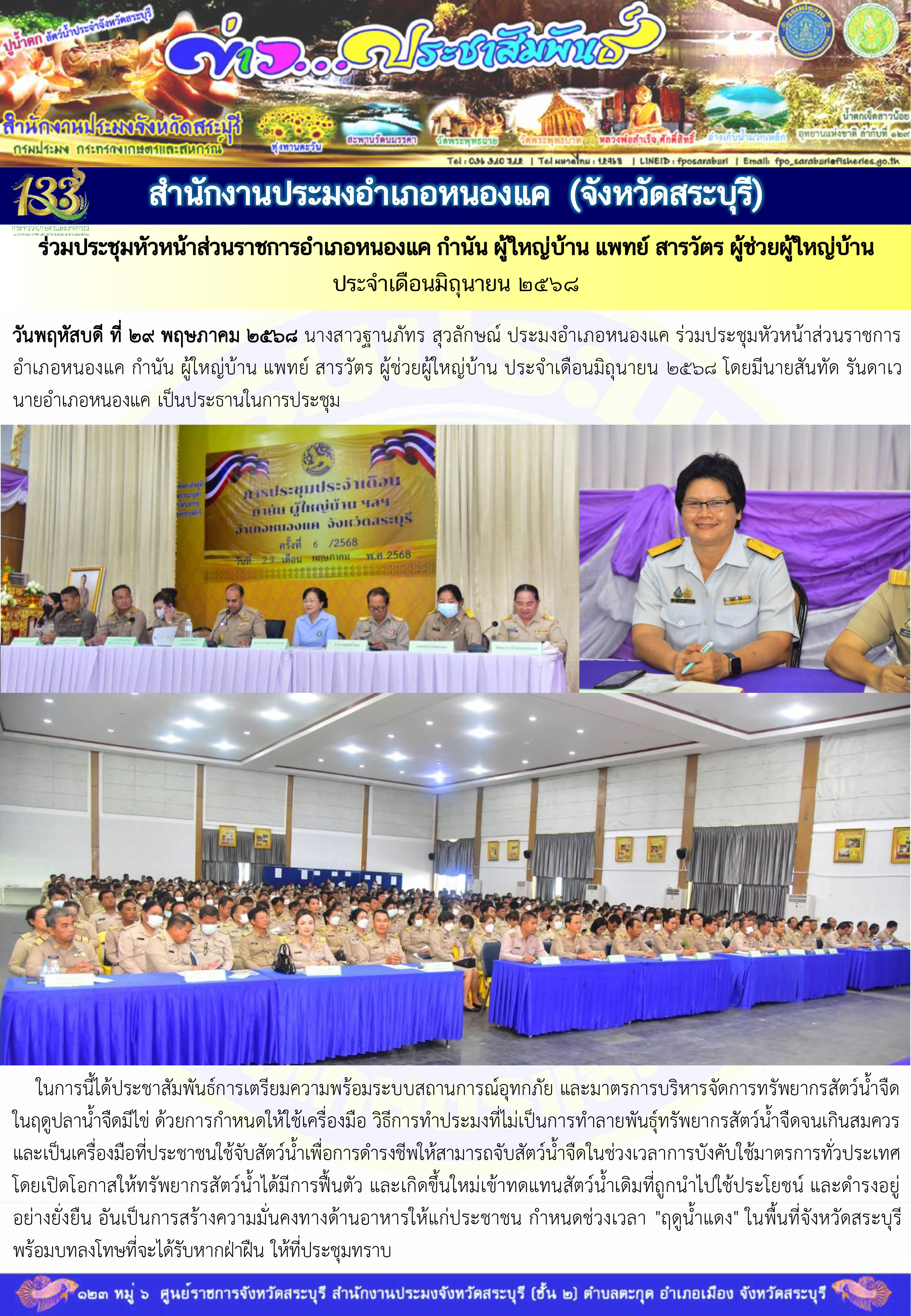 สำนักงานประมงอำเภอหนองแค ร่วมประชุมหัวหน้าส่วนราชการอำเภอหนองแค กำนัน ผู้ใหญ่บ้าน แพทย์ สารวัตร ผู้ช่วยผู้ใหญ่บ้าน ประจำเดือนมิถุนายน ๒๕๖๘