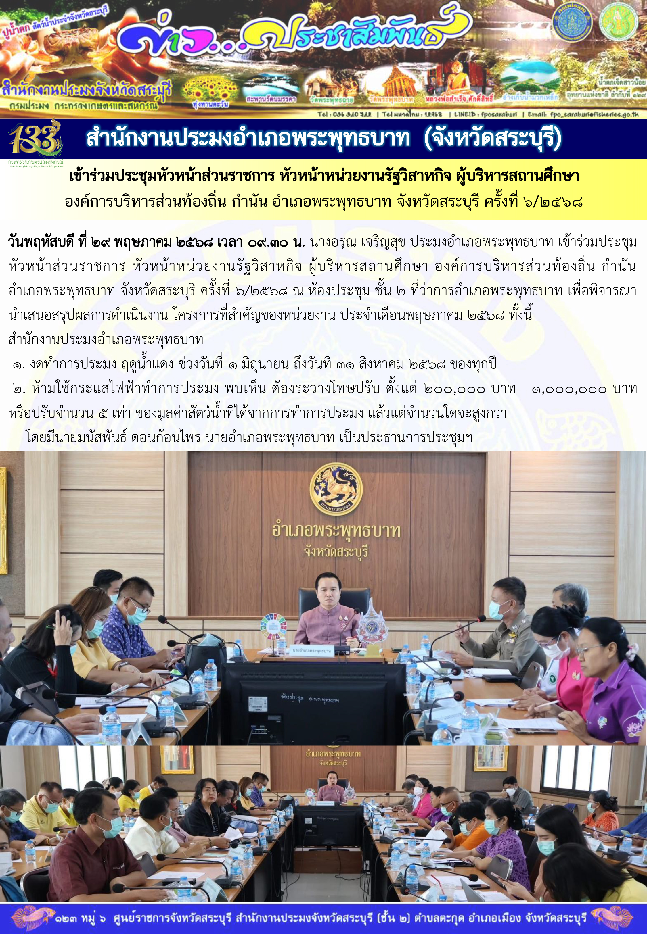 วันพฤหัสบดี ที่ ๒๙ พฤษภาคม ๒๕๖๘ เวลา ๐๙.๓๐ น. นางอรุณ เจริญสุข ประมงอำเภอพระพุทธบาท เข้าร่วมประชุมหัวหน้าส่วนราชการ หัวหน้าหน่วยงานรัฐวิสาหกิจ ผู้บริหารสถานศึกษา องค์การบริหารส่วนท้องถิ่น กำนัน อำเภอพระพุทธบาท จังหวัดสระบุรี ครั้งที่ ๖/๒๕๖๘ ณ ห้องประชุม ชั้น ๒ ที่ว่าการอำเภอพระพุทธบาท เพื่อพิจารณานำเสนอสรุปผลการดำเนินงาน โครงการที่สำคัญของหน่วยงาน ประจำเดือนพฤษภาคม ๒๕๖๘ ทั้งนี้