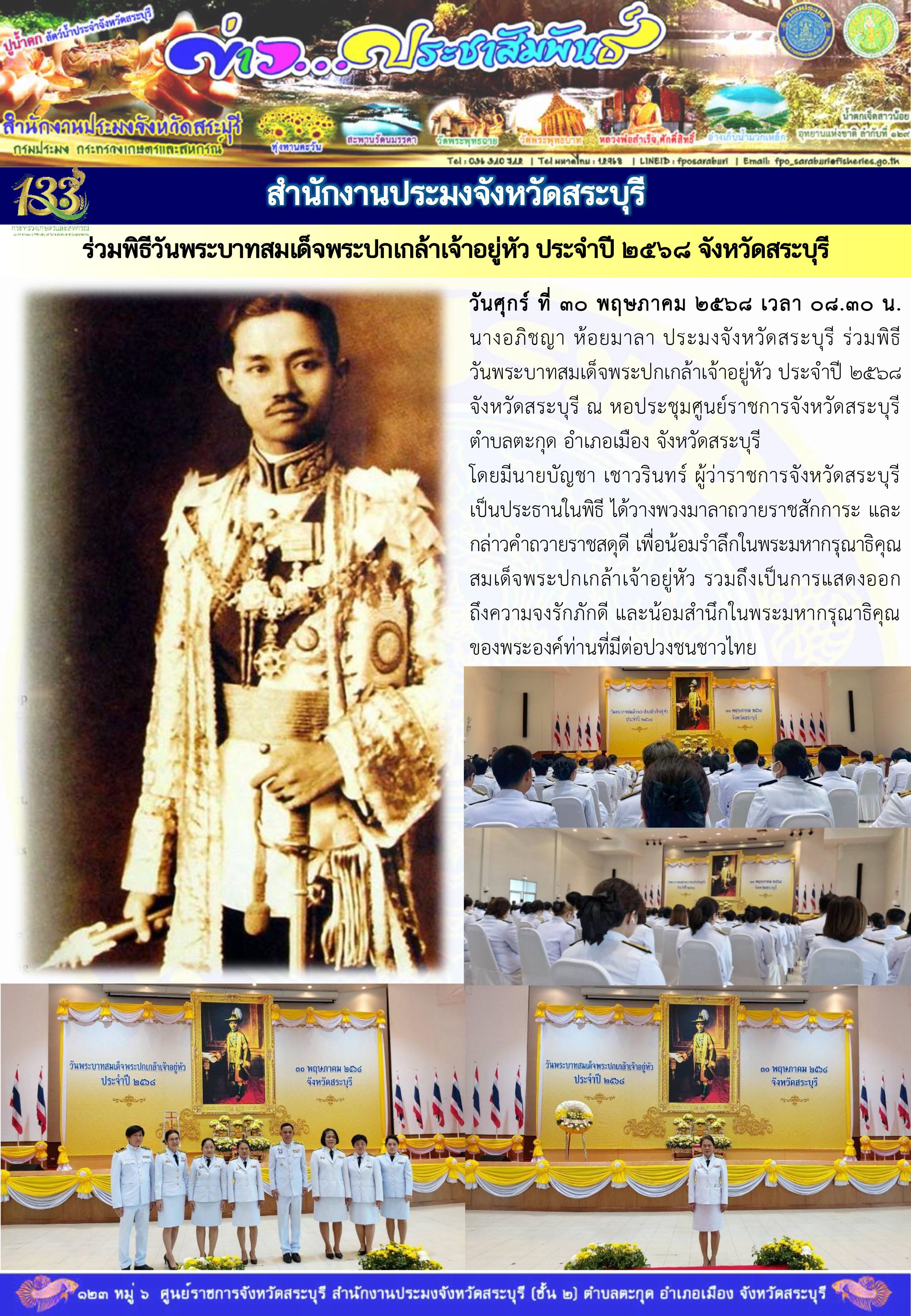 วันศุกร์ ที่ ๓๐ พฤษภาคม ๒๕๖๘ เวลา ๐๘.๓๐ น. นางอภิชญา ห้อยมาลา ประมงจังหวัดสระบุรี ร่วมพิธีวันพระบาทสมเด็จพระปกเกล้าเจ้าอยู่หัว ประจำปี ๒๕๖๘ จังหวัดสระบุรี ณ หอประชุมศูนย์ราชการจังหวัดสระบุรี ตำบลตะกุด อำเภอเมือง จังหวัดสระบุรี โดยมีนายบัญชา เชาวรินทร์ ผู้ว่าราชการจังหวัดสระบุรี เป็นประธานในพิธี ได้วางพวงมาลาถวายราชสักการะ และกล่าวคำถวาย ราชสดุดีเพื่อน้อมรำลึกในพระมหากรุณาธิคุณสมเด็จพระปกเกล้าเจ้าอยู่หัว รวมถึงเป็นการแสดงออกถึงความจงรักภักดี และน้อมสำนึกในพระมหากรุณาธิคุณของพระองค์ท่านที่มีต่อปวงชนชาวไทย