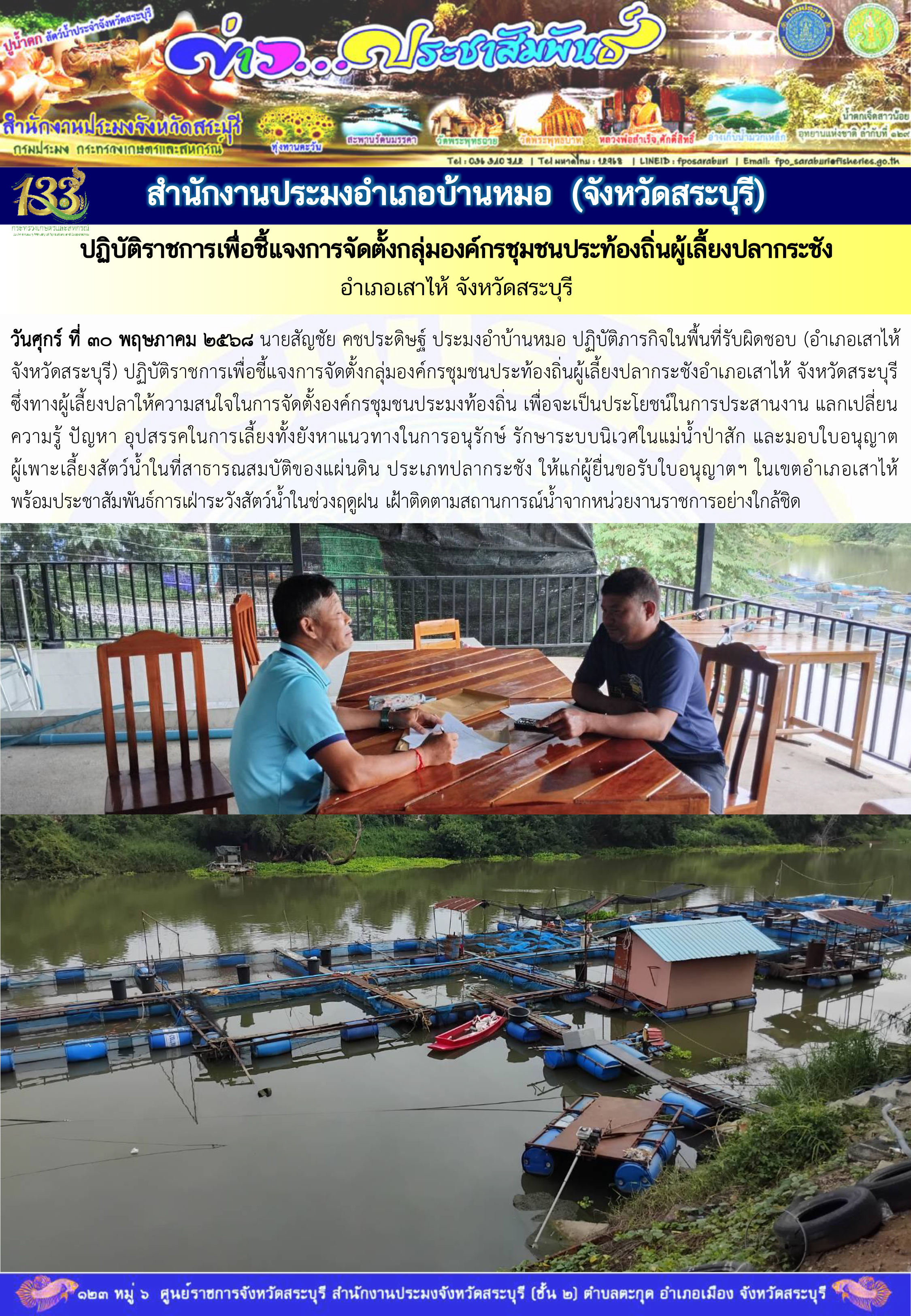 วันศุกร์ ที่ ๓๐ พฤษภาคม ๒๕๖๘ นายสัญชัย คชประดิษฐ์ ประมงอำบ้านหมอ ปฏิบัติภารกิจในพื้นที่รับผิดชอบ (อำเภอเสาไห้ จังหวัดสระบุรี) ปฏิบัติราชการเพื่อชี้แจงการจัดตั้งกลุ่มองค์กรชุมชนประท้องถิ่นผู้เลี้ยงปลากระชังอำเภอเสาไห้ จังหวัดสระบุรี ซึ่งทางผู้เลี้ยงปลาให้ความสนใจในการจัดตั้งองค์กรชุมชนประมงท้องถิ่น เพื่อจะเป็นประโยชน์ในการประสานงาน แลกเปลี่ยนความรู้ ปัญหา อุปสรรคในการเลี้ยงทั้งยังหาแนวทางในการอนุรักษ์ รักษาระบบนิเวศในแม่น้ำป่าสัก และมอบใบอนุญาตผู้เพาะเลี้ยงสัตว์น้ำในที่สาธารณสมบัติของแผ่นดิน ประเภทปลากระชัง ให้แก่ผู้ยื่นขอรับใบอนุญาตฯ ในเขตอำเภอเสาไห้ พร้อมประชาสัมพันธ์การเฝ่าระวังสัตว์น้ำในช่วงฤดูฝน เฝ้าติดตามสถานการณ์น้ำจากหน่วยงานราชการอย่างใกล้ชิด