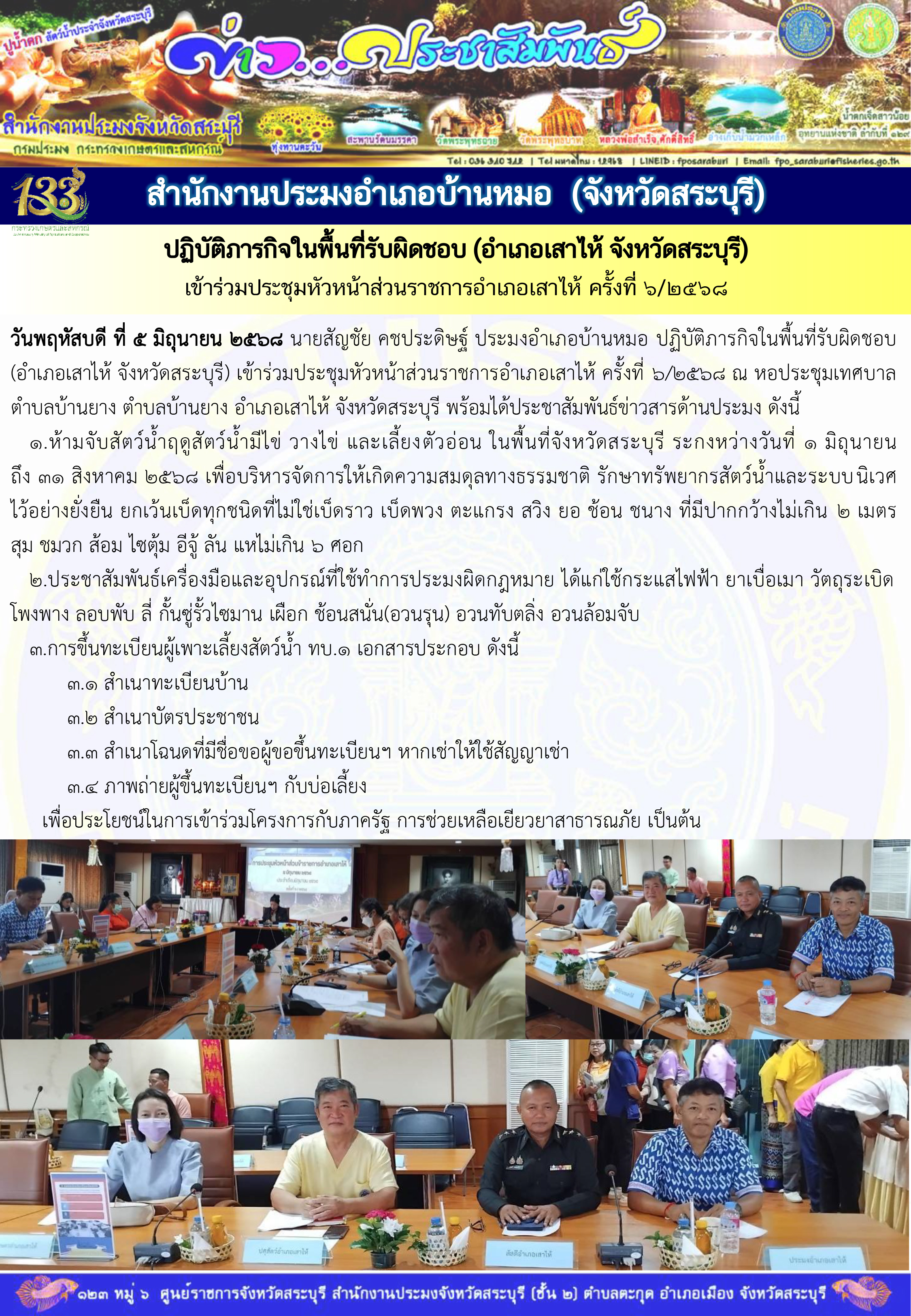 วันพฤหัสบดี ที่ ๕ มิถุนายน ๒๕๖๘ นายสัญชัย คชประดิษฐ์ ประมงอำเภอบ้านหมอ ปฏิบัติภารกิจในพื้นที่รับผิดชอบ (อำเภอเสาไห้ จังหวัดสระบุรี) เข้าร่วมประชุมหัวหน้าส่วนราชการอำเภอเสาไห้ ครั้งที่ ๖/๒๕๖๘ ณ หอประชุมเทศบาลตำบลบ้านยาง ตำบลบ้านยาง อำเภอเสาไห้ จังหวัดสระบุรี พร้อมได้ประชาสัมพันธ์ข่าวสารด้านประมง ดังนี้