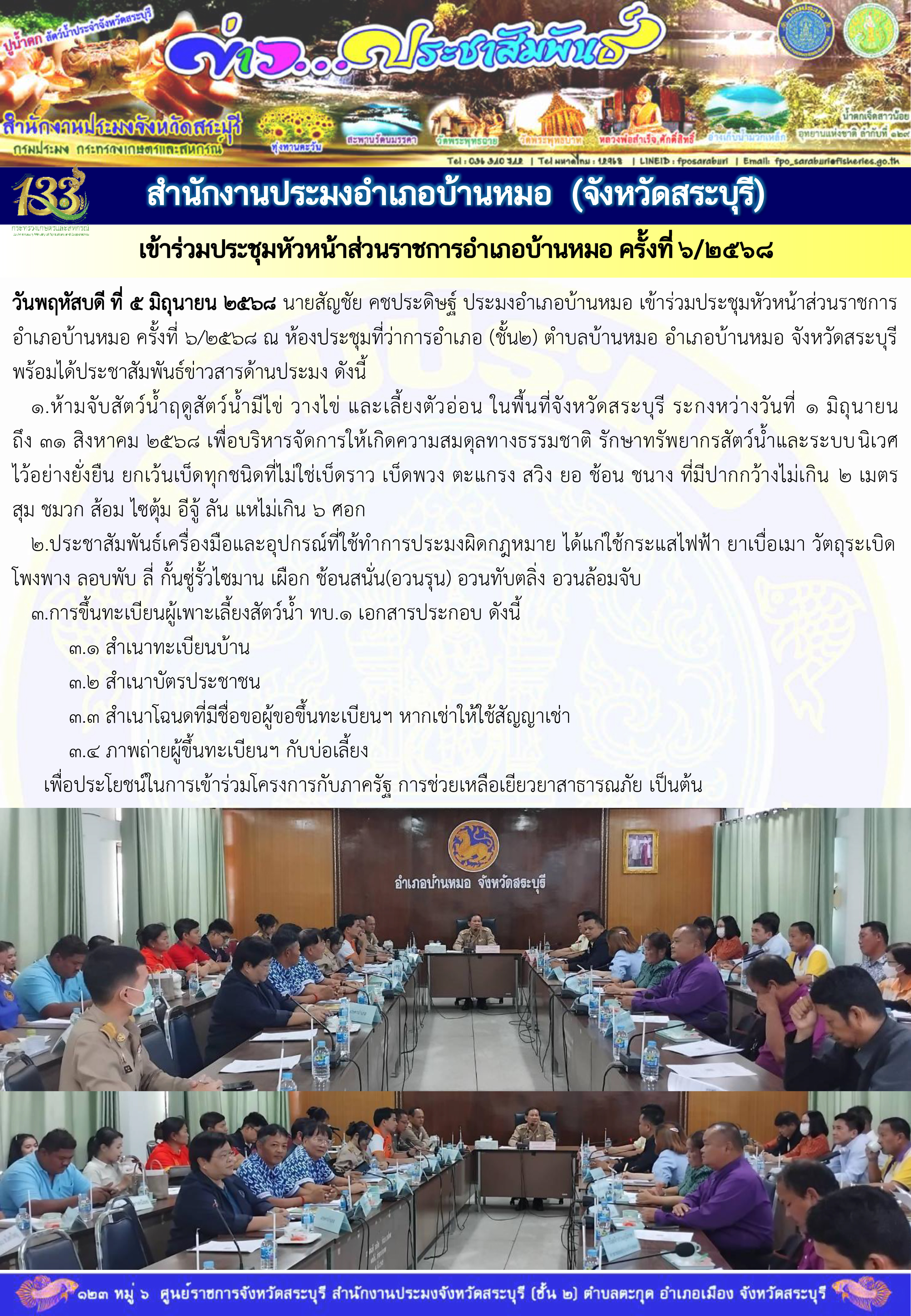 สำนักงานประมงอำเภอบ้านหมอ เข้าร่วมประชุมหัวหน้าส่วนราชการอำเภอบ้านหมอ ครั้งที่ ๖/๒๕๖๘