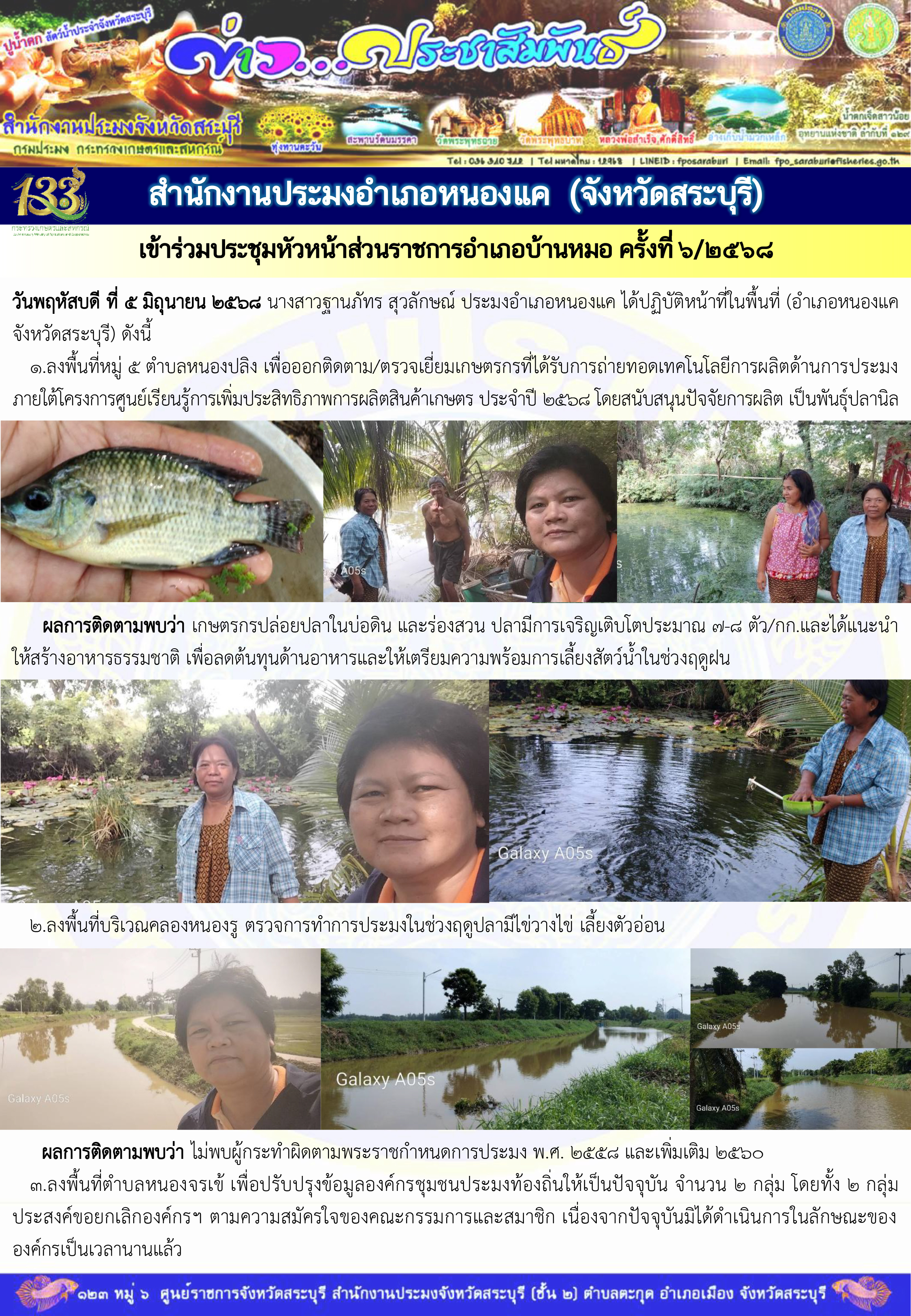 วันพฤหัสบดี ที่ ๕ มิถุนายน ๒๕๖๘ นางสาวฐานภัทร สุวลักษณ์ ประมงอำเภอหนองแค ได้ปฏิบัติหน้าที่ในพื้นที่ (อำเภอหนองแค จังหวัดสระบุรี) ดังนี้