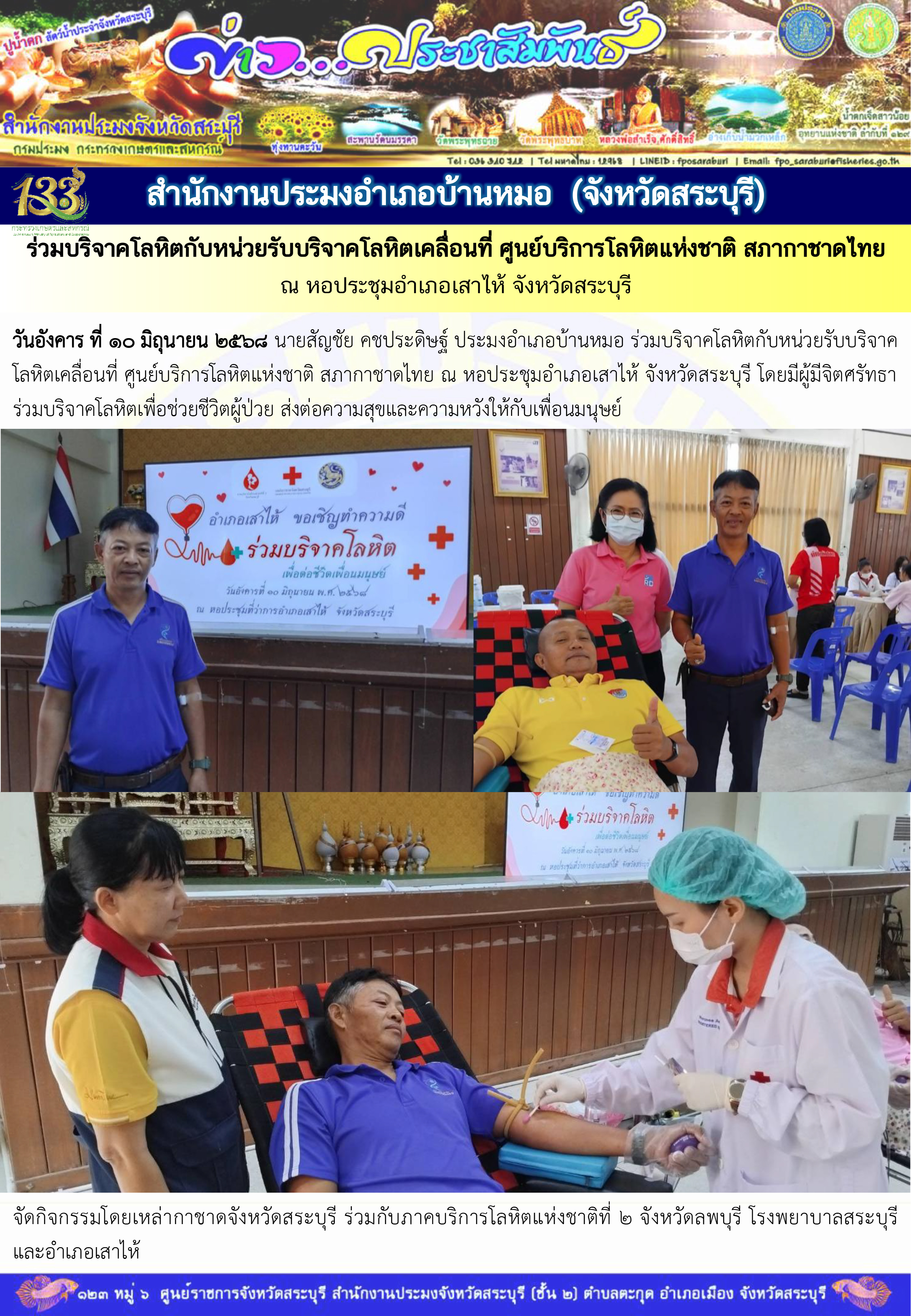 วันอังคาร ที่ ๑๐ มิถุนายน ๒๕๖๘ นายสัญชัย คชประดิษฐ์ ประมงอำเภอบ้านหมอ ร่วมบริจาคโลหิตกับหน่วยรับบริจาคโลหิตเคลื่อนที่ ศูนย์บริการโลหิตแห่งชาติ สภากาชาดไทย ณ หอประชุมอำเภอเสาไห้ จังหวัดสระบุรี โดยมีผู้มีจิตศรัทธาร่วมบริจาคโลหิตเพื่อช่วยชีวิตผู้ป่วย ส่งต่อความสุขและความหวังให้กับเพื่อนมนุษย์ จัดกิจกรรมโดยเหล่ากาชาดจังหวัดสระบุรี ร่วมกับภาคบริการโลหิตแห่งชาติที่ ๒ จังหวัดลพบุรี โรงพยาบาลสระบุรี และอำเภอเสาไห้